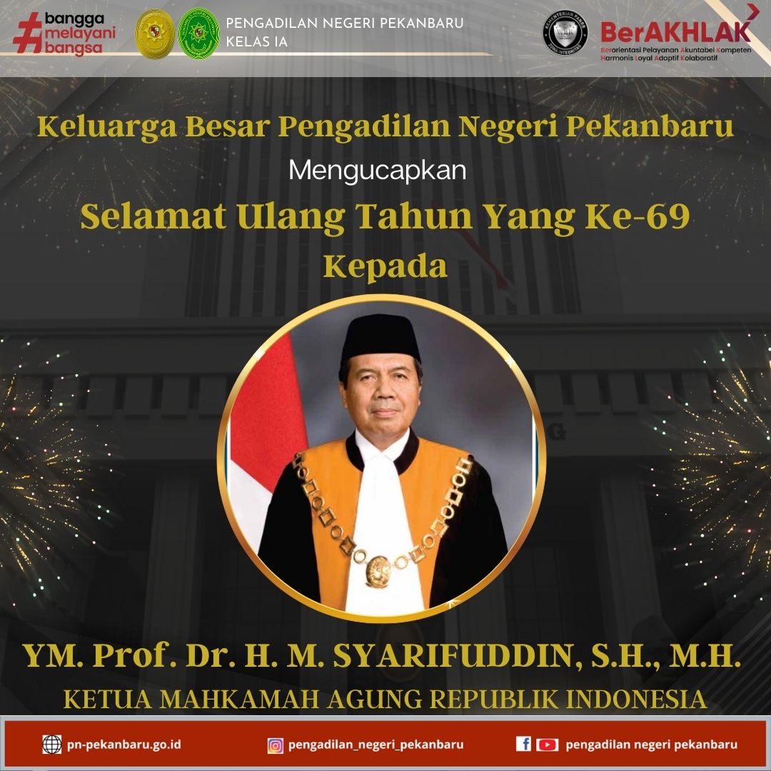 Keluarga Besar Pengadilan Negeri Pekanbaru Kelas IA Mengucapkan Selamat Ulang Tahun Yang Ke-69 Kepada YM. Prof. Dr. H. MUHAMMAD SYARIFUDDIN, S.H., M.H.