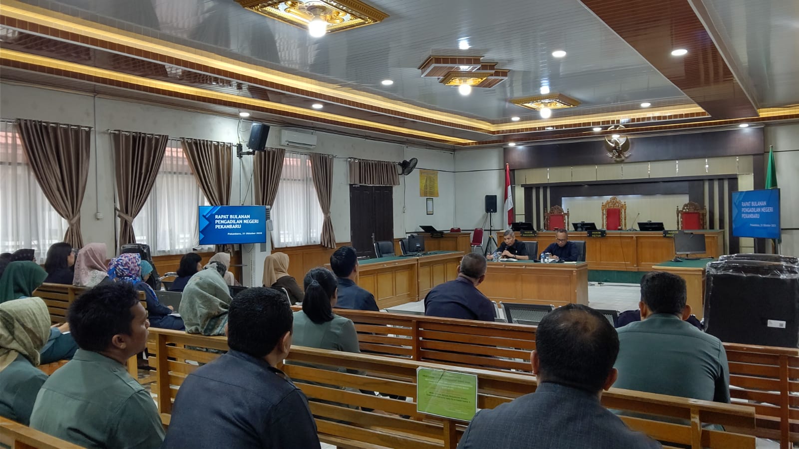 Agenda Rapat Bulanan adalah evaluasi kinerja kepaniteraan dan kesekretariatan, penyelesaian perkara, disiplin kerja, capaian kinerja dan pembinaan oleh Wakil Ketua Pengadilan Negeri Pekanbaru.