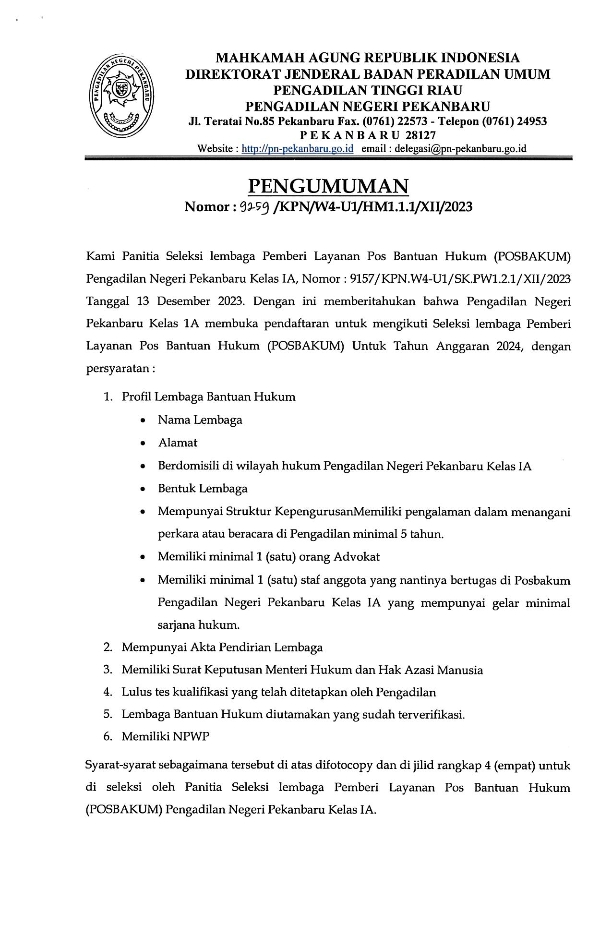 Kami Panitia Seleksi lembaga Pemberi Layanan Pos Bantuan Hukum (POSBAKUM) Pengadilan Negeri Pekanbaru Kelas IA, Nomor: 9157/KPN.W4-Ul/SK.PW1.2.1/XII/2023