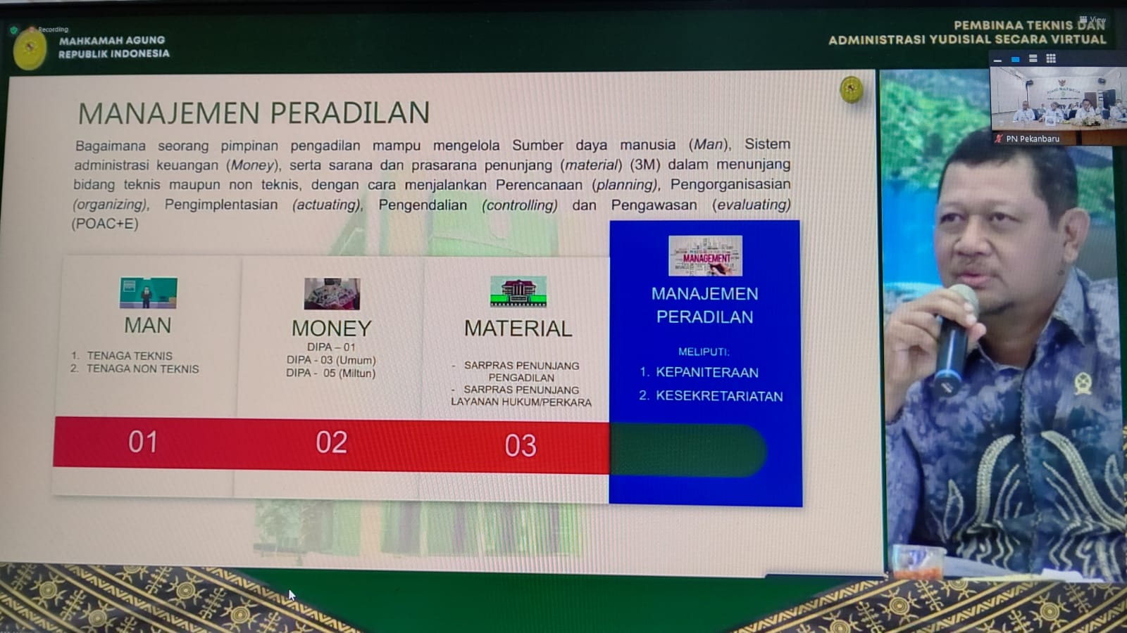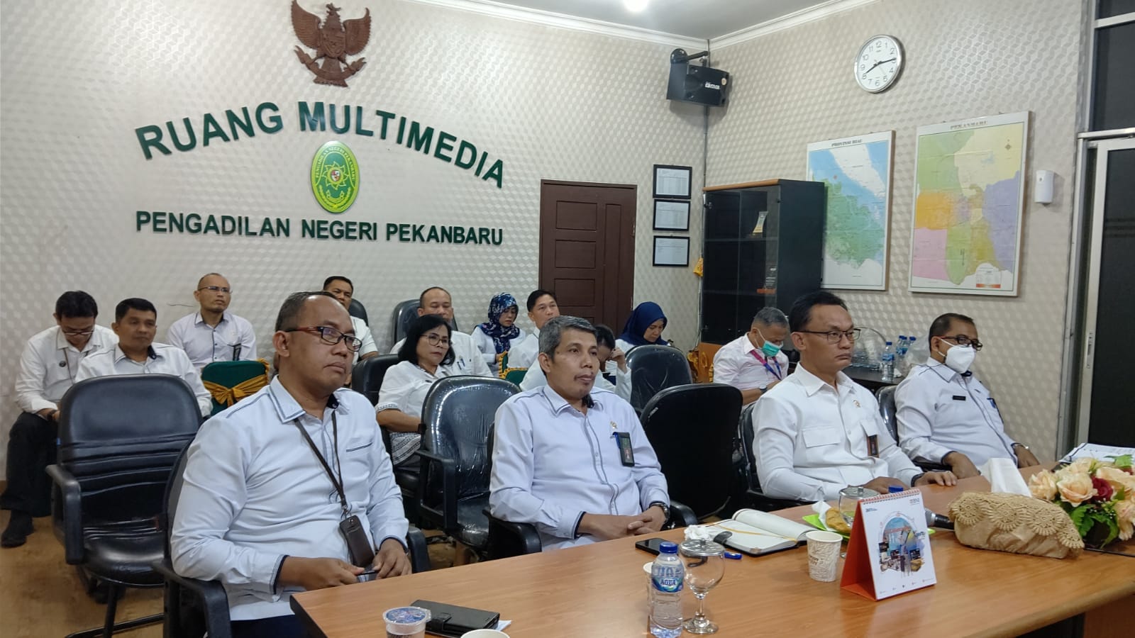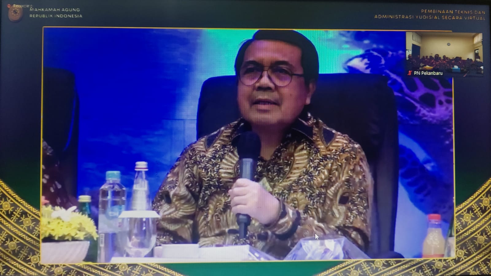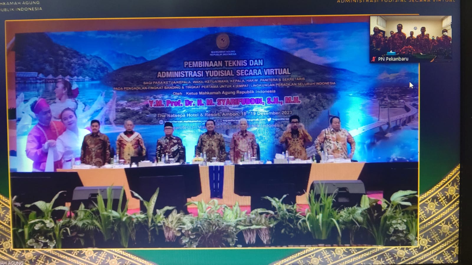 Pekanbaru, Senin 18 Desember 2023 - Bertempat di Ruang Multimedia Pengadilan Negeri Pekanbaru dilaksanakan Pembinaan Teknis dan Administrasi Yudisial Secara Virtual Bagi Ketua, Wakil Ketua, Hakim, Panitera dan Sekretaris pada Pengadilan Tingkat Banding dan Tingkat Pertama untuk Empat Lingkungan Peradilan Seluruh Indonesia oleh Ketua Mahkamah Agung RI Bapak Prof. Dr. H. M. Syarifuddin , S.H., M.H.. Acara ini dihadiri oleh Ketua PN Pekanbaru Bapak Muhammad Arif Nuryanta, S.H., M.H., Wakil Ketua Bapak Mardison, SH, Para Hakim Karir dan Hakim Adhoc, Panitera dan Sekretaris Pengadilan Negeri Pekanbaru.