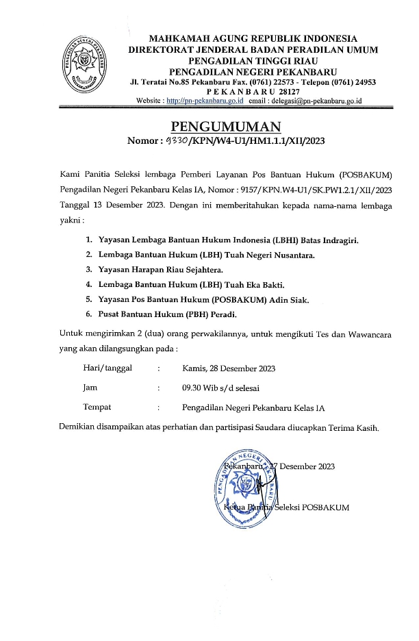 Pengumuman Tes Wawancara Layanan Pos Bantuan Hukum (POSBAKUM) Tahun 2024 pada Pengadilan Negeri Pekanbaru