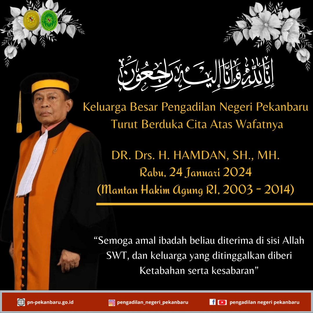 KELUARGA BESAR PENGADILAN NEGERI PEKANBARU Mengucapkan TURUT BERDUKA CITA ATAS WAFATNYA DR. Drs. H. HAMDAN, SH., MH.