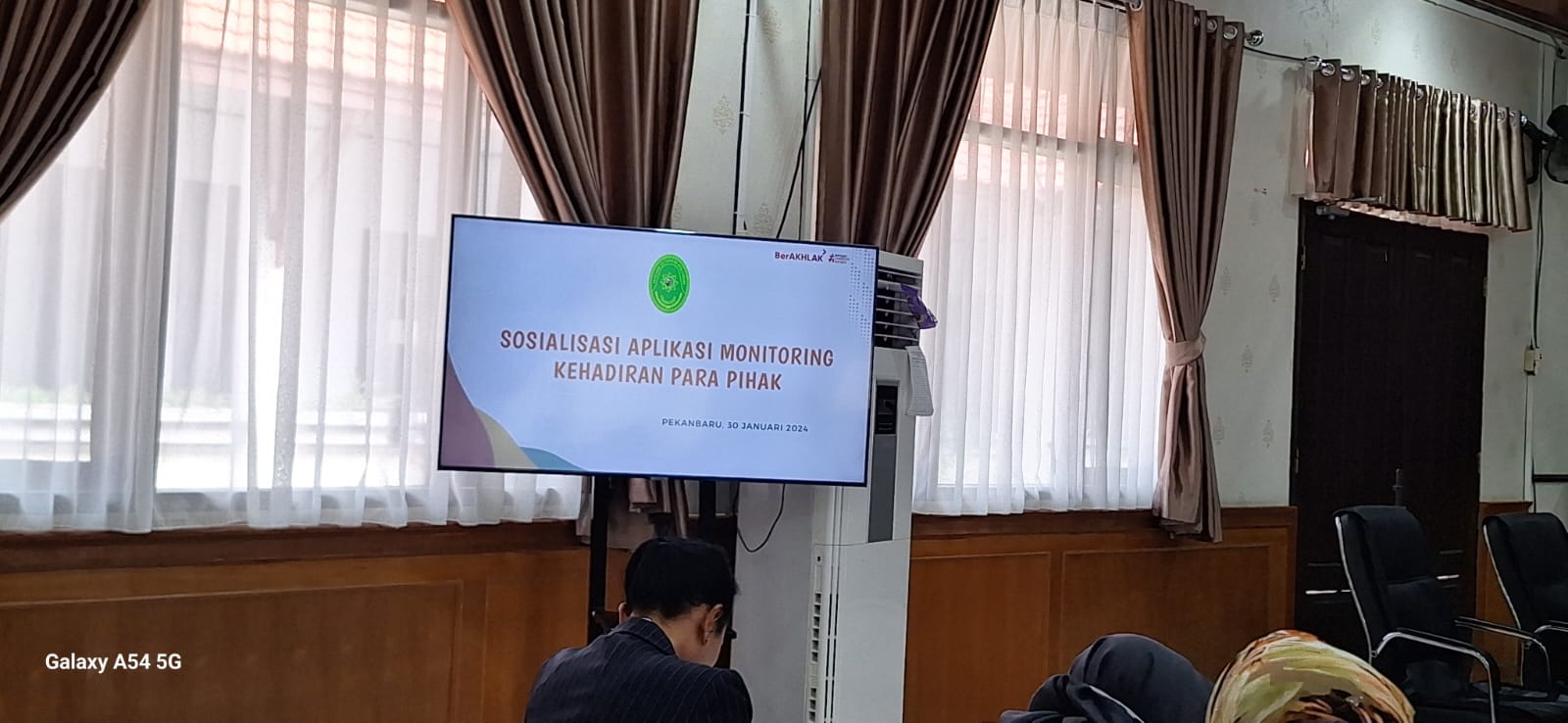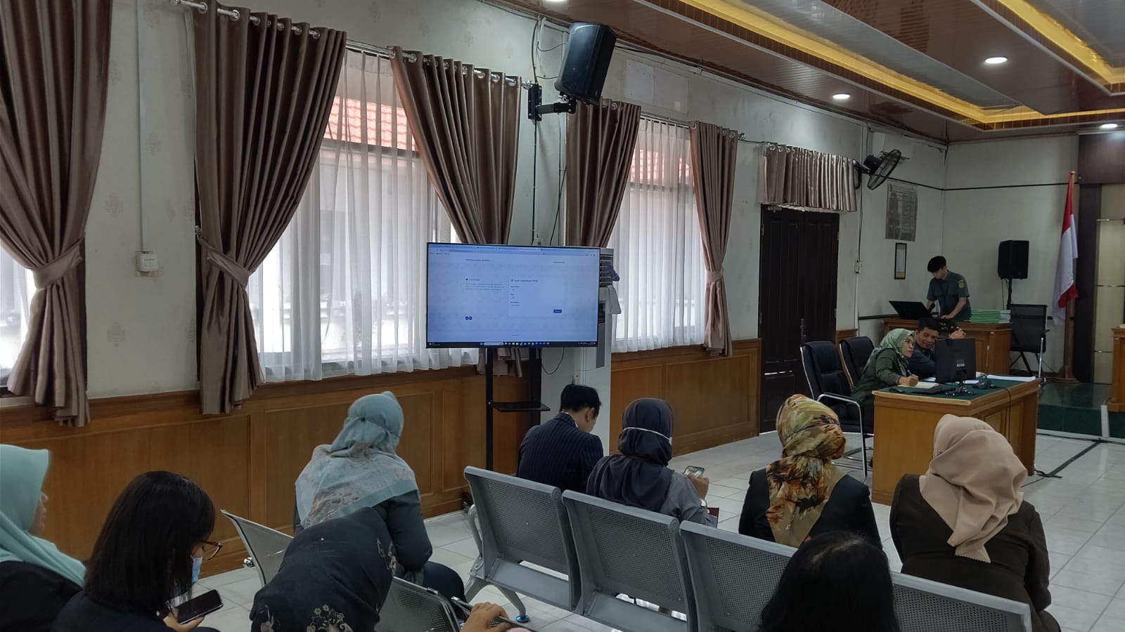 Pekanbaru – Selasa, 30 Januari 2024. Bertempat di Ruang Sidang Prof. R. Soebekti, SH dilaksanakan Sosialisasi Aplikasi Monitoring Kehadiran Para Pihak dimana Hakim dan Panitera Pengganti dapat memonitoring kehadiran para pihak yang akan mengikuti persidangan di Pengadilan Negeri Pekanbaru. Sosialisasi Aplikasi Monitoring Kehadiran Para Pihak tersebut dipimpin oleh Ketua Pengadilan Negeri Pekanbaru Bapak Mashuri Effendie, S.H., M.H. didampingi Wakil Ketua Pengadilan Negeri Pekanbaru Bapak Mardison, SH dan dihadiri oleh Para Hakim, Hakim Ad Hoc Tipikor, Hakim Ad Hoc PHI, Panitera, Sekretaris, Pejabat Struktural, Pejabat Fungsional, Pelaksana, dan Pegawai Pemerintah Non Pegawai Negeri (PPNPN) pada Pengadilan Negeri Pekanbaru. Narasumber Sosialisasi Aplikasi Monitoring Kehadiran Para Pihak tersebut adalah Pranata Komputer Ahli Pertama Bapak Febriandri Afli, S.Si.