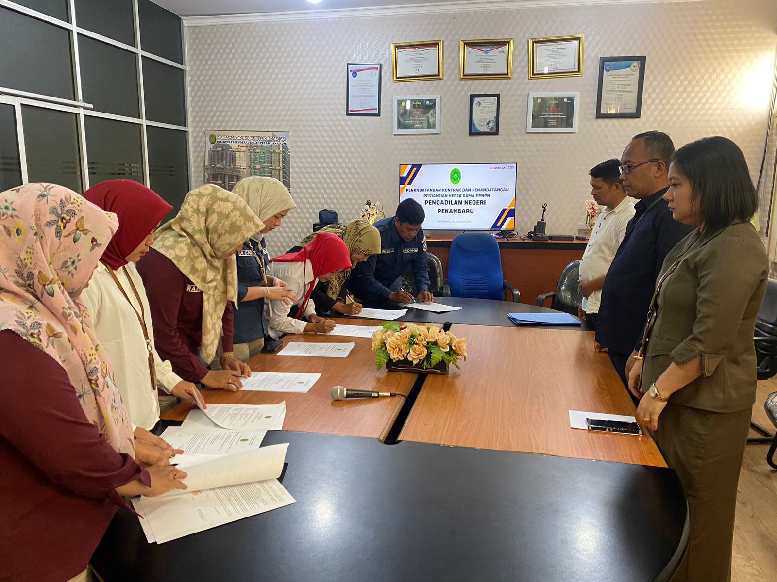 Pekanbaru, Rabu - 03 Januari 2024. Bertempat di Ruang Multimedia Pengadilan Negeri Pekanbaru dilaksanakan Penandatanganan Perjanjian Kinerja dan Pengucapan Perjanjian Kinerja Pegawai Pemerintah Non Pegawai Negeri (PPNPN) Tahun 2024 Pada Pengadilan Negeri Pekanbaru. Acara ini dihadiri oleh Sekretaris Pengadilan Negeri Pekanbaru Bapak Erry Mardianto, ST., SH., didampingi oleh Kasub Bagian Kepegawaian dan Organisasi Tata Laksana, dan Kasub Bagian Umum dan Keuangan serta seluruh Pegawai Pemerintah Non Pegawai Negeri (PPNPN) Pengadilan Negeri Pekanbaru. Â