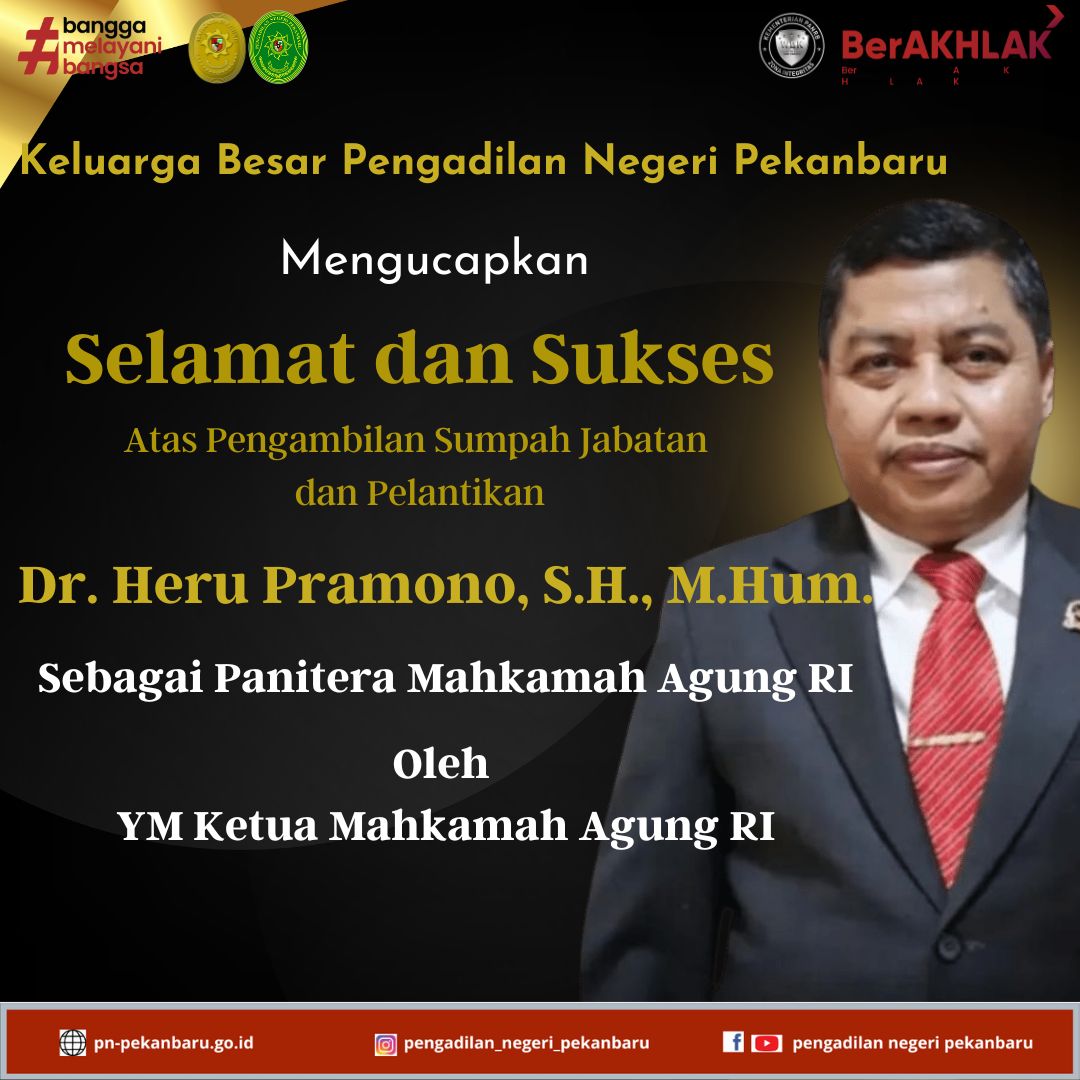 KELUARGA BESAR PENGADILAN NEGERI PEKANBARU Mengucapkan Selamat dan Sukses Atas Pengambilan Sumpah Jabatan dan Pelantikan Dr. Heru Pramono, S.H., M.Hum. Sebagai Panitera Mahkamah Agung RI