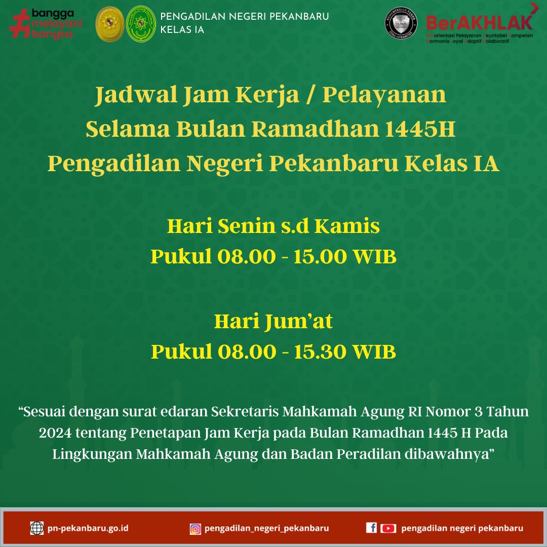 Jadwal Jam Kerja / Pelayanan Selama Bulan Ramadhan 1445H Pengadilan Negeri Pekanbaru Kelas IA