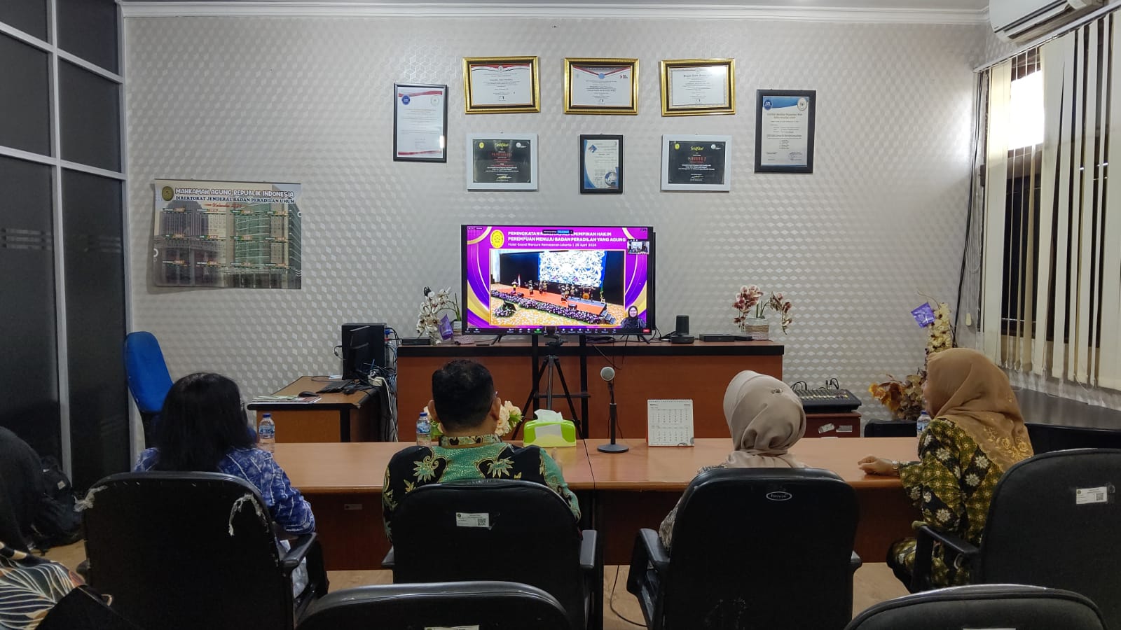 Pekanbaru – Jumat, 26 April 2024. Bertempat di Ruang Command Center Pengadilan Negeri Pekanbaru, Ketua Pengadilan Negeri Pekanbaru Bapak Mashuri Effendie, S.H., M.H. dan Seluruh Hakim Perempuan Pengadilan Negeri Pekanbaru mengikuti Seminar Internasional dan diskusi mengenai Judicial Wellbeing dan Sharing Knowledge dengan Organisasi Hakim Perempuan secara Daring. Acara Seminar tersebut dilaksanakan dalam rangka Memperingati Hari Perempuan Internasional (8 Maret), Hari Hakim Perempuan Internasional (10 Maret) dan Hari Kartini (21 April) Tahun 2024 dengan tema Peningkatan Kepemimpinan Hakim Perempuan Menuju Badan Peradilan yang Agung oleh Badan Perhimpunan Hakim Perempuan Indonesia Ikatan Hakim Indonesia.Â