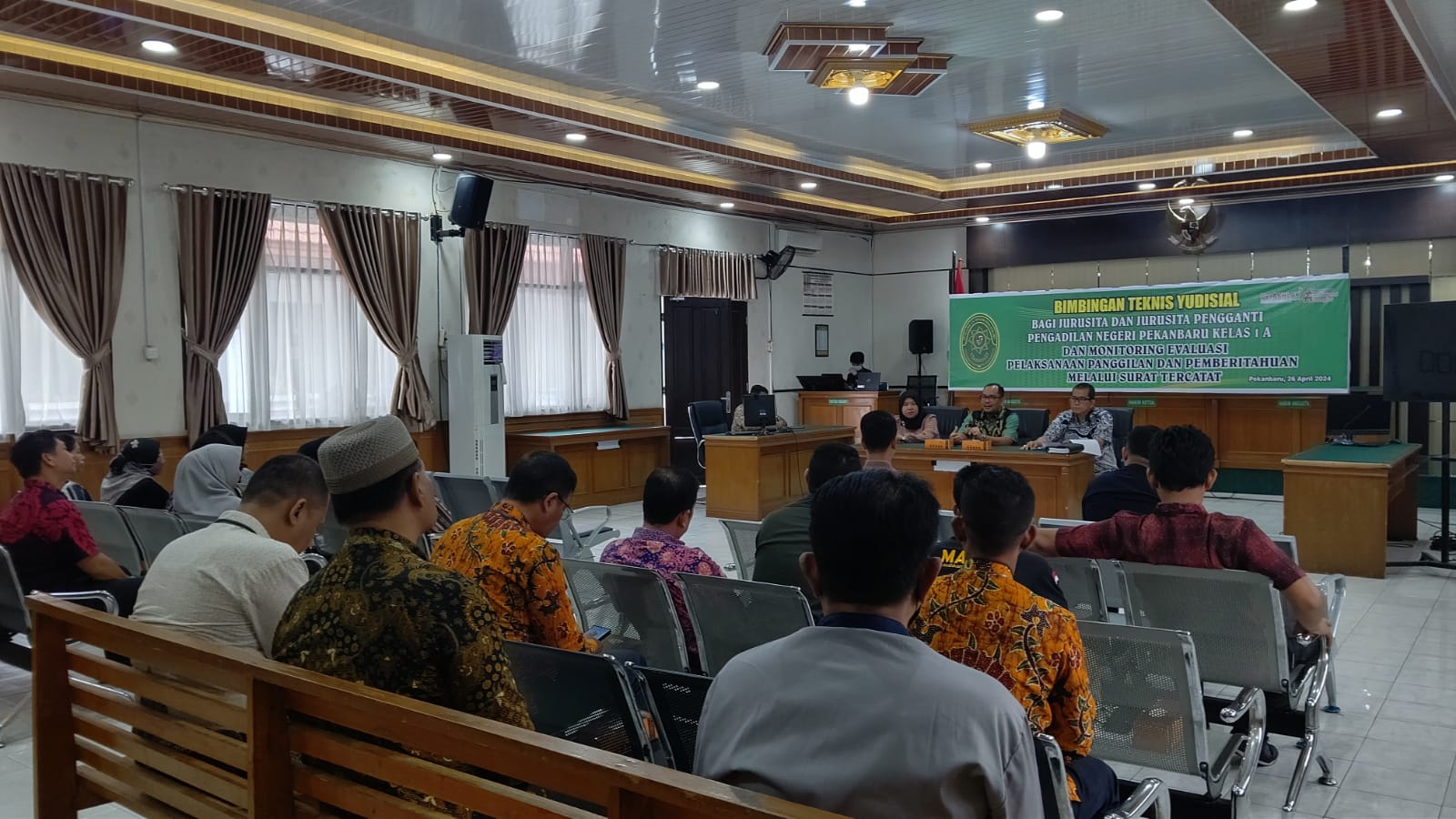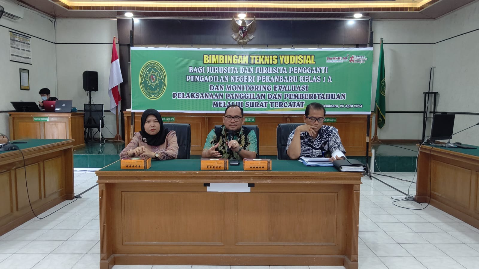 Pekanbaru – Jumat, 26 April 2024. Bertempat di Ruang Sidang Prof. R. Soebekti, SH dilaksanakan Bimbingan Teknis Yudisial Jurusita dan Jurusita Pengganti serta monitoring evaluasi pelaksanaan panggilan pemberitahuan melalui surat tercatat Pada Pengadilan Negeri Pekanbaru. Bimbingan teknis tersebut dipimpin oleh Ketua Pengadilan Negeri Pekanbaru Bapak Mashuri Effendie, S.H., M.H., dan dihadiri oleh Hakim, Hakim Ad Hoc, Panitera, Panitera Muda, Jurusita, dan Jurusita Pengganti pada Pengadilan Negeri Pekanbaru serta perwakilan dari pihak PT POS Indonesia.
