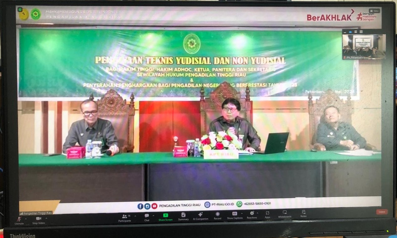 Pekanbaru, Selasa - 07 Mei 2024. Bertempat di Ruang Multimedia Pengadilan Negeri Pekanbaru, Wakil Ketua, Hakim, dan Pejabat Struktural Pengadilan Negeri Pekanbaru mengikuti Kegiatan Pembinaan Teknis Yudisial dan Non Yudisial bagi Pengadilan Sewilayah Hukum Pengadilan Tinggi Riau Secara Daring. Sedangkan Ketua Pengadilan Negeri Pekanbaru Bapak Mashuri Effendie, S.H., M.H, Panitera, dan Sekretaris Pengadilan Negeri Pekanbaru mengikuti Kegiatan Pembinaan Teknis Yudisial dan Non Yudisial tersebut secara Langsung di Pengadilan Tinggi Riau.