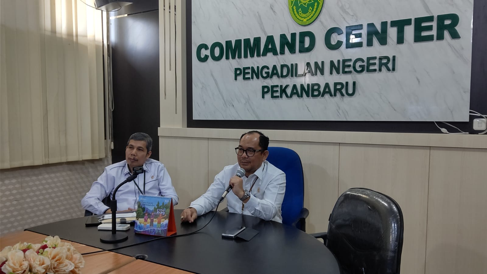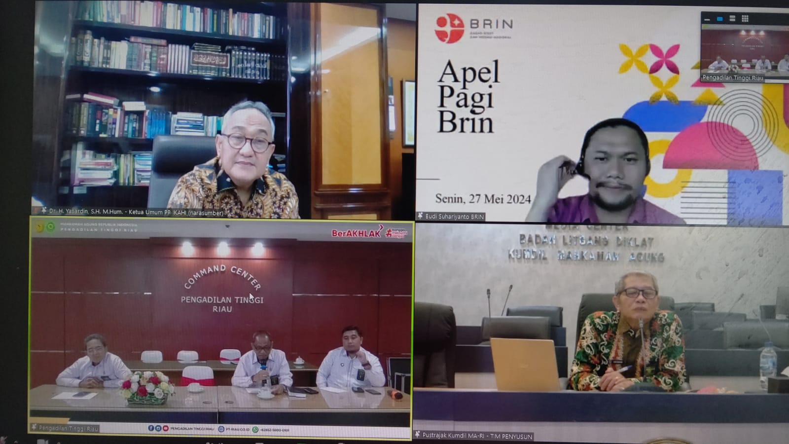 Pekanbaru, Senin - 27 Mei 2024. Bertempat di Ruang Multimedia Pengadilan Negeri Pekanbaru, Ketua Pengadilan Negeri Pekanbaru Bapak Mashuri Effendie, S.H., M.H didampingi Wakil Ketua Pengadilan Negeri Pekanbaru Bapak Mardison, SH. mengikuti Kegiatan Focus Group Discussion (FGD) Pengumpulan Data dalam Penyusunan Naskah Kebijakan Tahun Anggaran 2024 dengan judul Pengaturan Eselonisasi Jabatan Struktural dalam SK MA No. 48 Tahun 2017 tentang Pola Promosi dan Mutasi Hakim pada Empat (4) Lingkungan Peradilan di Bawah Mahkamah Agung oleh Kepala Pusat Strategi Kebijakan Hukum dan Peradilan Badan Strategi Kebijakan Diklat Kumdil Mahkamah Agung RI Secara Daring.Â