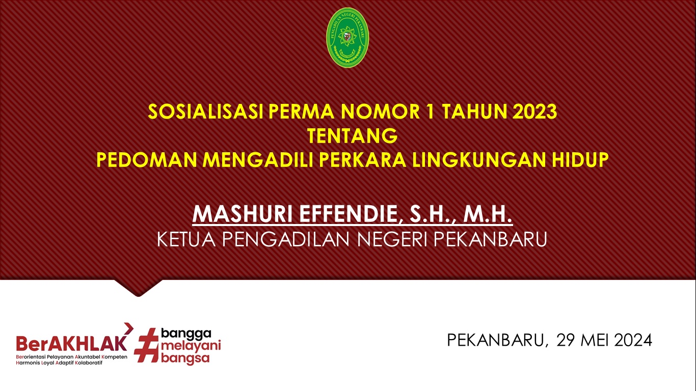Pekanbaru – Rabu, 29 Mei 2024. Bertempat di Ruang Sidang Prof. R. Soebekti, SH dilaksanakan Kegiatan Sosialisasi Perma No. 1 Tahun 2023 Tentang Pedoman Mengadili Perkara Lingkungan Hidup Pada Pengadilan Negeri Pekanbaru. Sosialisasi tersebut dipimpin oleh Ketua Pengadilan Negeri Pekanbaru Bapak Mashuri Effendie, S.H., M.H., didampingi oleh Wakil Ketua Pengadilan Negeri Pekanbaru Bapak Mardison, SH dan dihadiri oleh Para Hakim, Hakim Ad Hoc Tipikor, Hakim Ad Hoc PHI, Panitera, Sekretaris, Pejabat Struktural, Pejabat Fungsional, Pelaksana, dan Pegawai Pemerintah Non Pegawai Negeri (PPNPN) pada Pengadilan Negeri Pekanbaru.