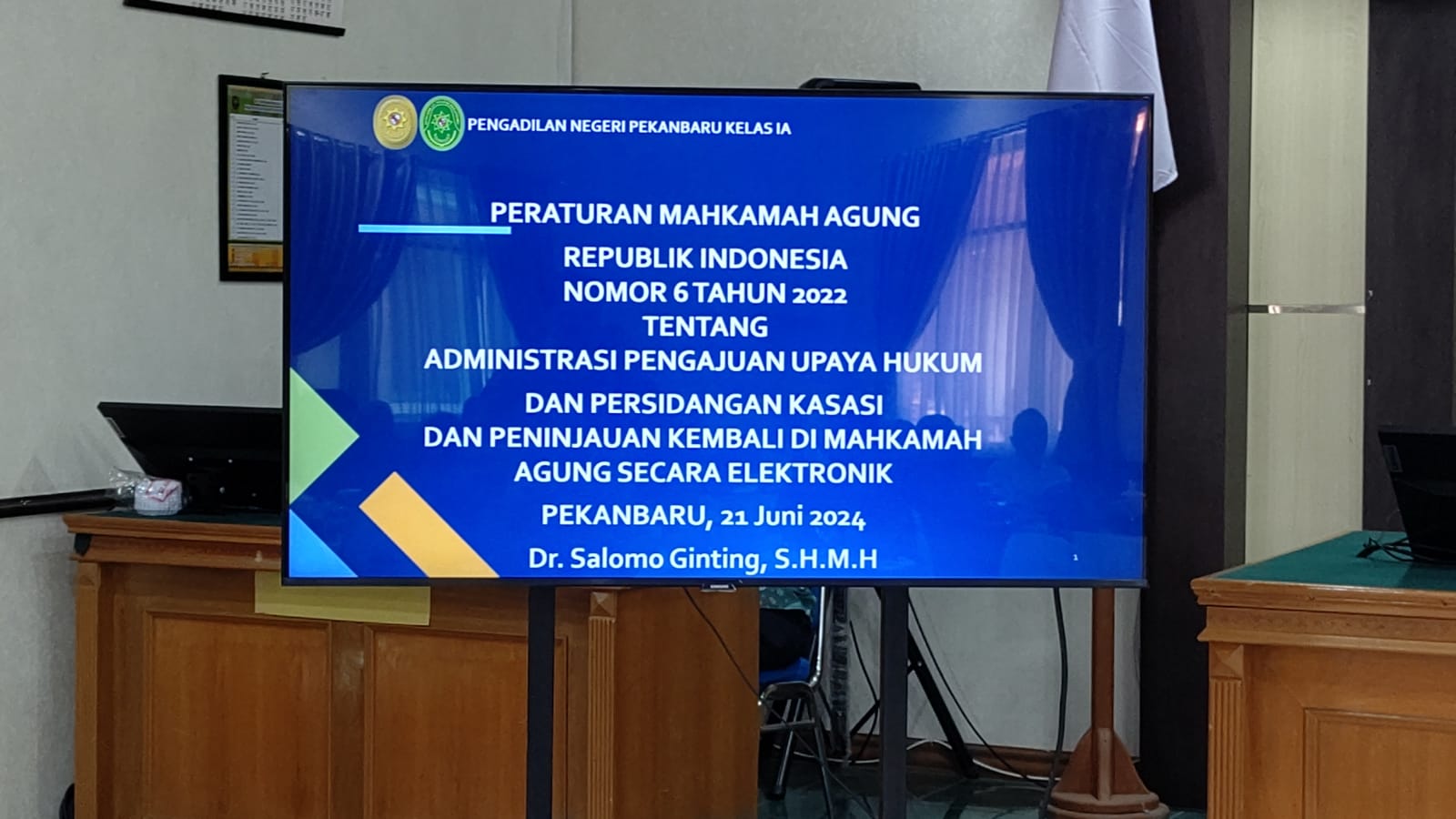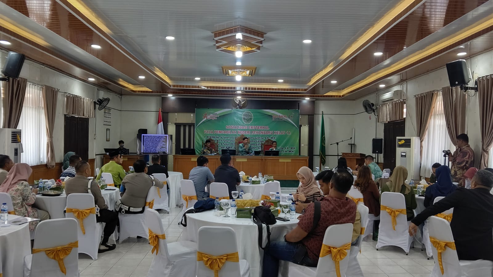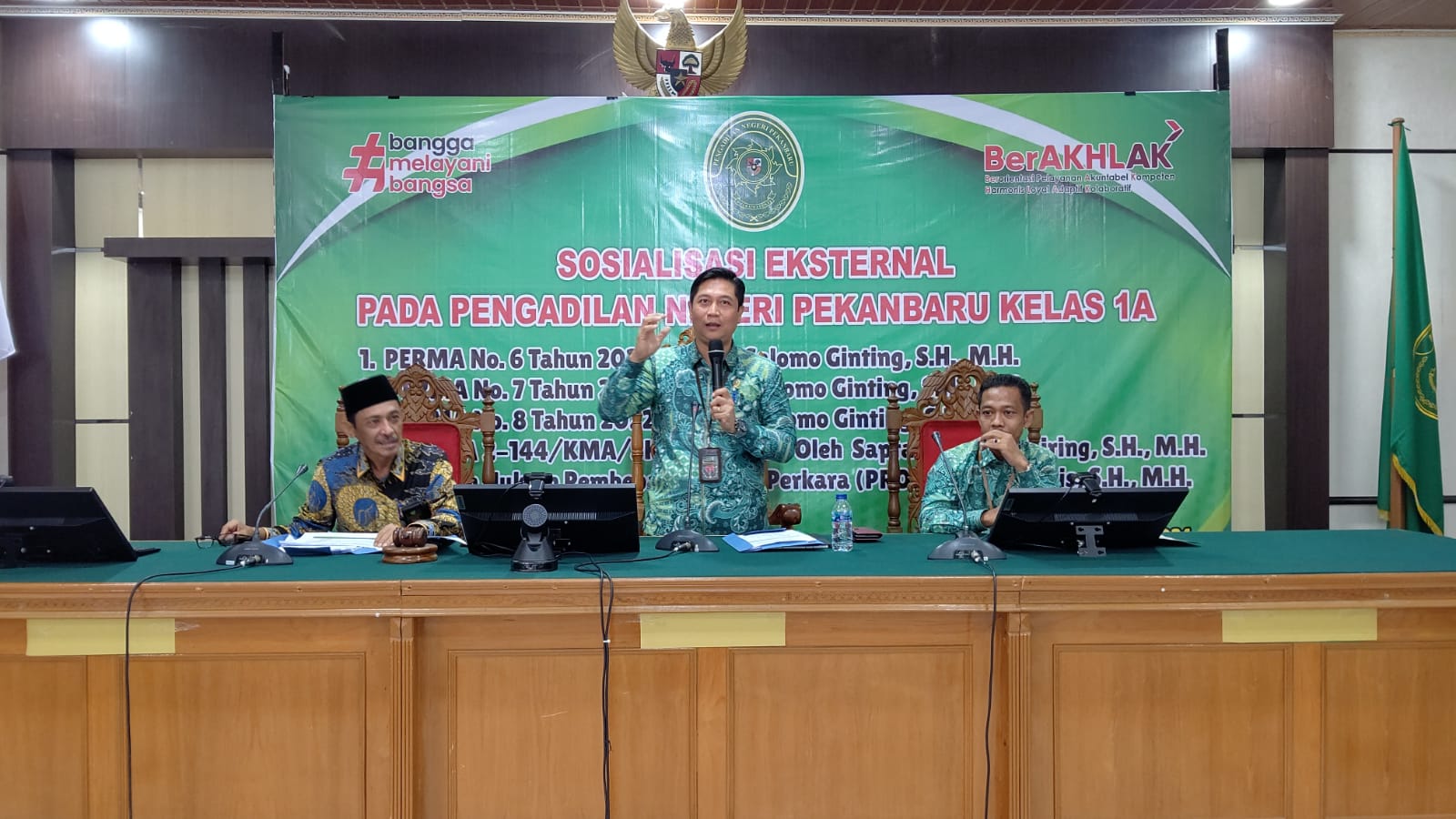 Pekanbaru – Jum’at, 21 Juni 2024. Bertempat di Ruang Sidang Prof. R. Soebekti, SH pada Pengadilan Negeri Pekanbaru dilaksanakan Kegiatan Sosialisasi Perma No. 6 Tahun 2022, Perma No. 7 Tahun 2022, Perma No. 8 Tahun 2022, SK KMA No. 2-144/KMA/SK/VII/2022, dan Perma No. 1 Tahun 2014 Kepada Pihak Eksternal. Sosialisasi tersebut dipimpin oleh Ketua Pengadilan Negeri Pekanbaru Bapak Mashuri Effendie, S.H., M.H. dan dihadiri oleh BNN Kota Pekanbaru, Kepolisian Resor Kota Pekanbaru, Kejaksaan Negeri Pekanbaru, Kepolisian Sektor di Pekanbaru, Ikatan Advokat Indonesia Pekanbaru, Perhimpunan Advokat Indonesia Pekanbaru, DPD Kongres Advokat Indonesia Riau, dan Perwakilan Perbankan di Pekanbaru. Narasumber Sosialisasi PERMA tersebut adalah Hakim Pengadilan Negeri Pekanbaru Bapak Dr. Salomo Ginting, S.H., M.H., Panitera Pengadilan Negeri Pekanbaru Bapak Idris, S.H., M.H., dan Panitera Muda Hukum Bapak Sapta Putra Sembiring, S.H., M.H.