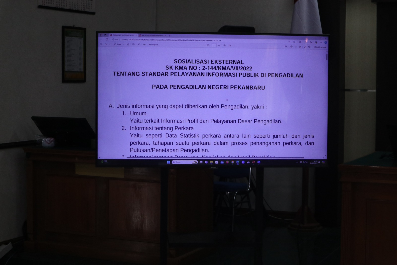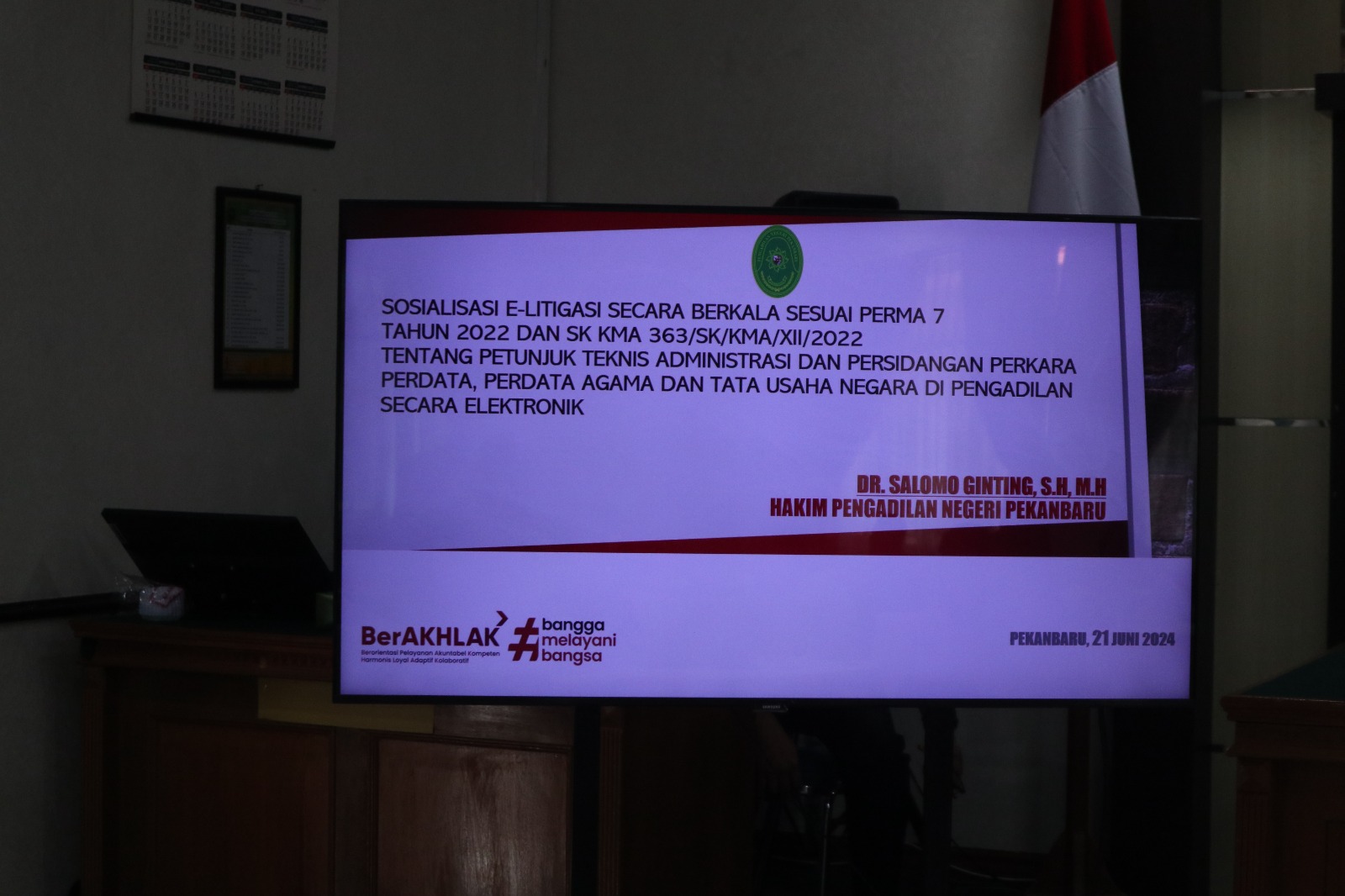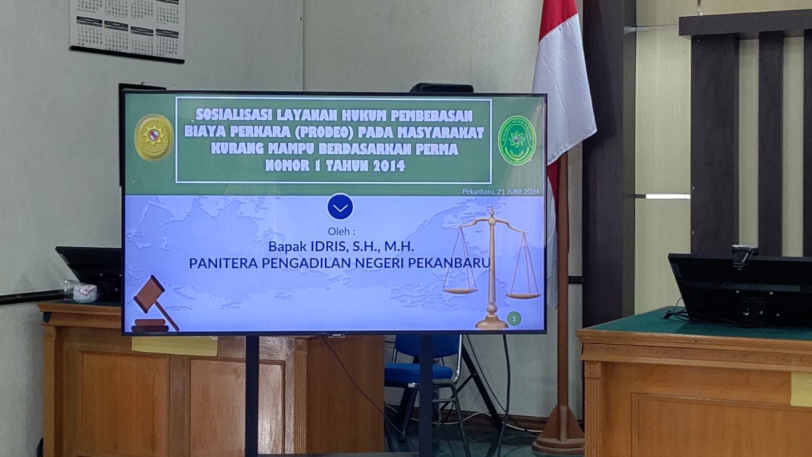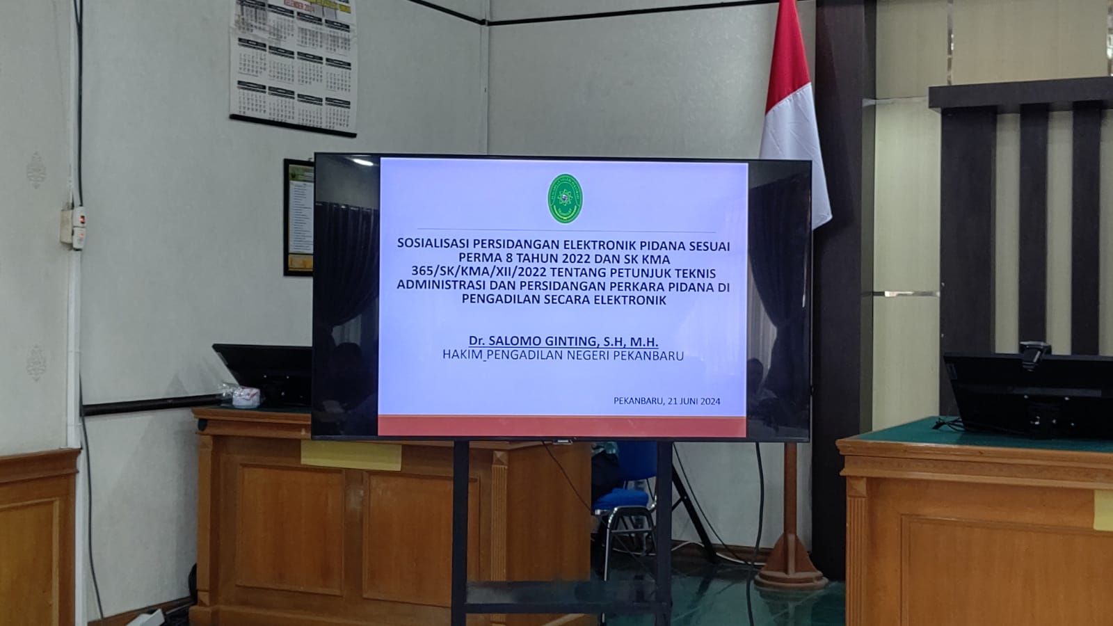 Pekanbaru – Jum’at, 21 Juni 2024. Bertempat di Ruang Sidang Prof. R. Soebekti, SH pada Pengadilan Negeri Pekanbaru dilaksanakan Kegiatan Sosialisasi Perma No. 6 Tahun 2022, Perma No. 7 Tahun 2022, Perma No. 8 Tahun 2022, SK KMA No. 2-144/KMA/SK/VII/2022, dan Perma No. 1 Tahun 2014 Kepada Pihak Eksternal. Sosialisasi tersebut dipimpin oleh Ketua Pengadilan Negeri Pekanbaru Bapak Mashuri Effendie, S.H., M.H. dan dihadiri oleh BNN Kota Pekanbaru, Kepolisian Resor Kota Pekanbaru, Kejaksaan Negeri Pekanbaru, Kepolisian Sektor di Pekanbaru, Ikatan Advokat Indonesia Pekanbaru, Perhimpunan Advokat Indonesia Pekanbaru, DPD Kongres Advokat Indonesia Riau, dan Perwakilan Perbankan di Pekanbaru. Narasumber Sosialisasi PERMA tersebut adalah Hakim Pengadilan Negeri Pekanbaru Bapak Dr. Salomo Ginting, S.H., M.H., Panitera Pengadilan Negeri Pekanbaru Bapak Idris, S.H., M.H., dan Panitera Muda Hukum Bapak Sapta Putra Sembiring, S.H., M.H.