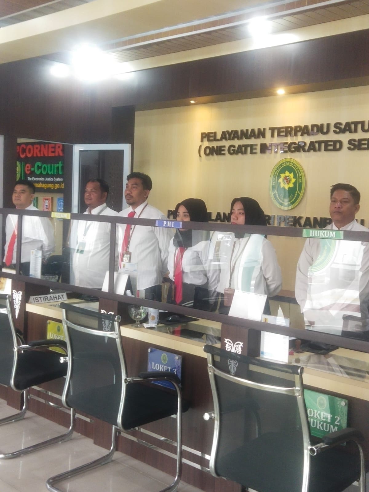 Pekanbaru - Rabu, 17 Juli 2024. Bertempat di Ruang Pelayanan Terpadu Satu Pintu (PTSP) Pengadilan Negeri Pekanbaru telah dilaksanakan pembinaan PTSP oleh Ketua Pengadilan Negeri Pekanbaru dan Monitoring PTSP oleh Hakim Pengawas PTSP kepada Petugas PTSP Pengadilan Negeri Pekanbaru. Dalam Pembinaan dan Monitoring PTSP tersebut, Ketua dan Hakim Pengawas PTSP Pengadilan Negeri Pekanbaru mengingatkan kepada para petugas untuk memberikan pelayanan terbaik kepada masyarakat sesuai SOP serta menerapkan 5S dan 5R.