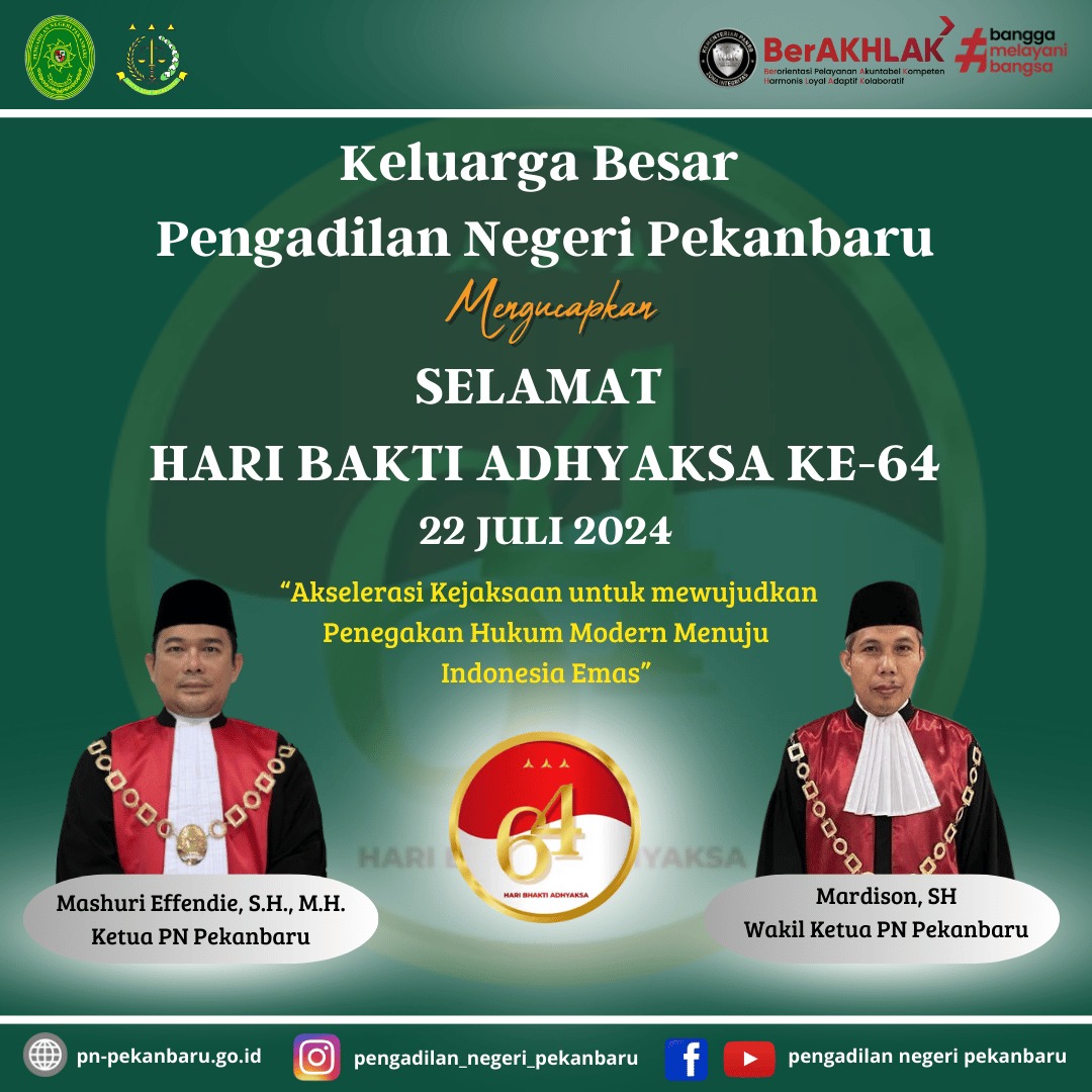 Keluarga Besar Pengadilan Negeri Pekanbaru Kelas IA Mengucapkan SELAMAT 64TH HARI BHAKTI ADHYAKSA