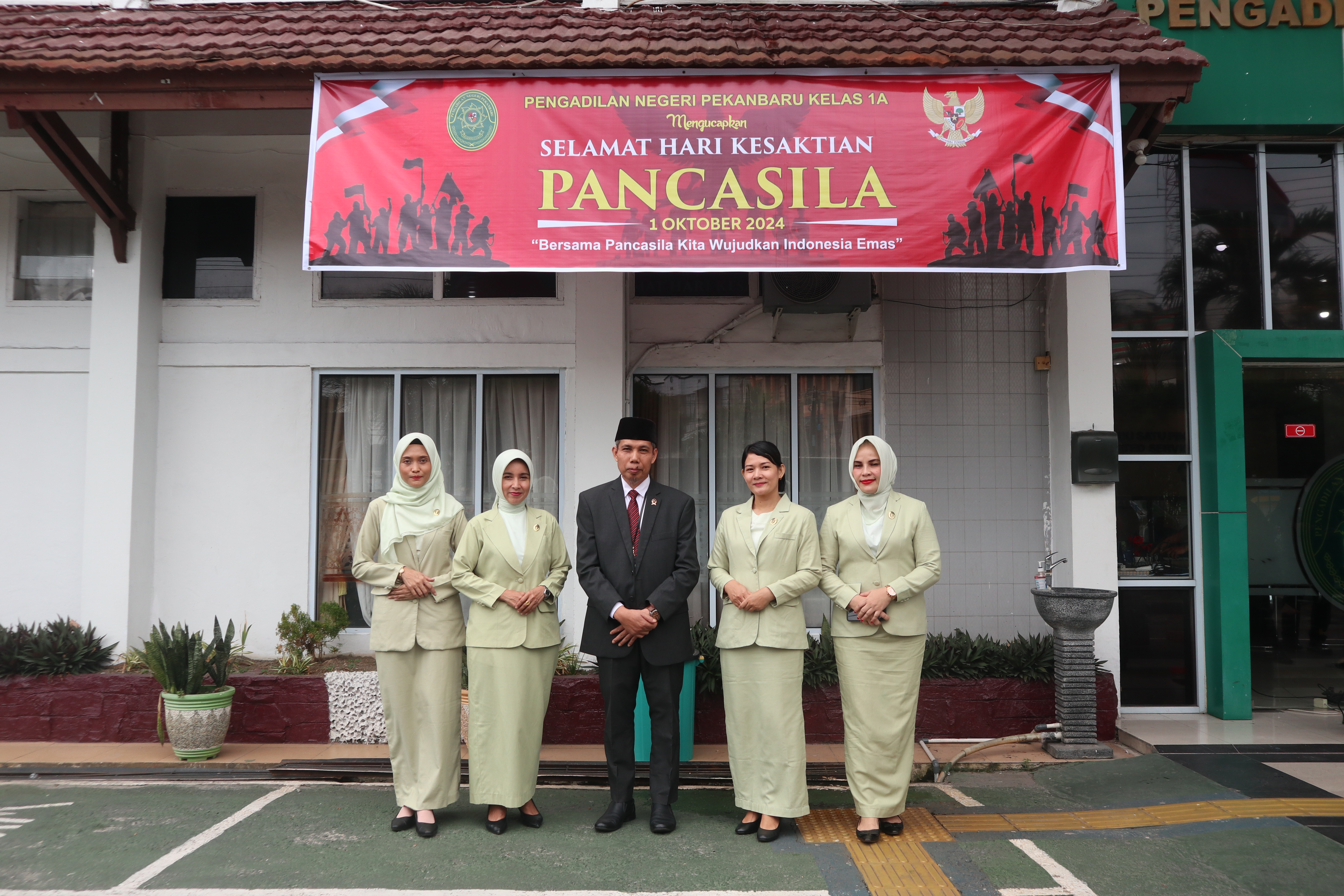 Selasa, 01-10-2024 | 10:48:16 WIBPekanbaru – Selasa, 01 Oktober 2024. Upacara memperingati Hari Kesaktian Pancasila dilaksanakan di halaman Kantor Pengadilan Negeri Pekanbaru. Upacara tersebut dipimpin oleh Wakil Ketua Pengadilan Negeri Pekanbaru Bapak Mardison, S.H. selaku Pembina Upacara. Turut serta dalam upacara tersebut Para Hakim, Panitera, Sekretaris, Pejabat Struktural, Pejabat Fungsional, Pelaksana, dan Pegawai Pemerintah Non Pegawai Negeri (PPNPN) Pengadilan Negeri Pekanbaru serta Pengurus dan Anggota Darmayukti Karini Cabang Pekanbaru. Tema Peringatan Hari Kesaktian Pancasila Tahun 2024 adalah “Bersama Pancasila Kita Wujudkan Indonesia Emasâ€.