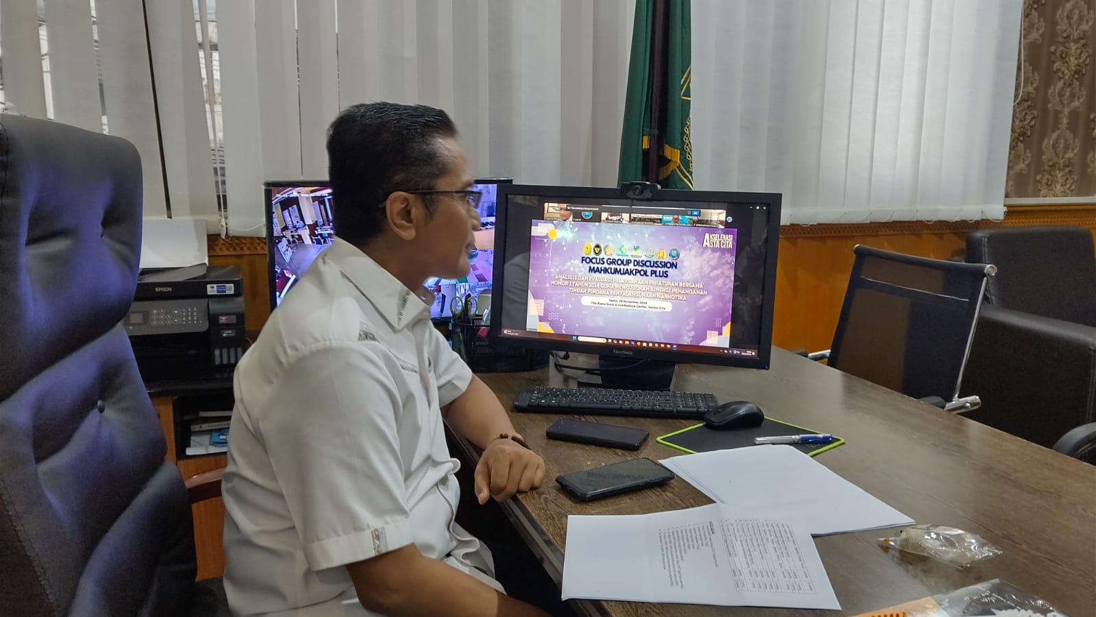 Pekanbaru, Senin - 25 November 2024. Bertempat di Ruang Pimpinan Pengadilan Negeri Pekanbaru, Ketua Pengadilan Negeri Pekanbaru Bapak Raden Heru Kuntodewo, S.H., M.H. mengikuti Kegiatan Focus Group Discussion (FGD) MAHKUMJAKPOL PLUS dengan tema Analisis dan Evaluasi Pelaksanaan Peraturan Bersama Nomor 1 tahun 2014 Guna Mewujudkan Sinergi Penanganan Tindak Pidana Penyalahgunaan Narkotika Secara Daring.