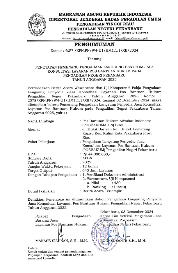 Berdasarkan Berita Acara Wawancara dan Uji Kompetensi Pokja Pengadaan Langsung Penyedia Jasa Konsultasi Layanan Pos Bantuan Hukum Pengadilan Negeri Pekanbaru Tahun Anggaran 2025 Nomor : 2078/KPN.PN/W4-U1/HM1.1.1/XII/2024, tanggal 02 Desember 2024, maka ditetapkan bahwa Pemenang Pengadaan Langsung Penyedia Jasa Konsultasi Layanan Pos Bantuan Hukum pada Pengadilan Negeri Pekanbaru Tahun Anggaran 2025, yaitu :