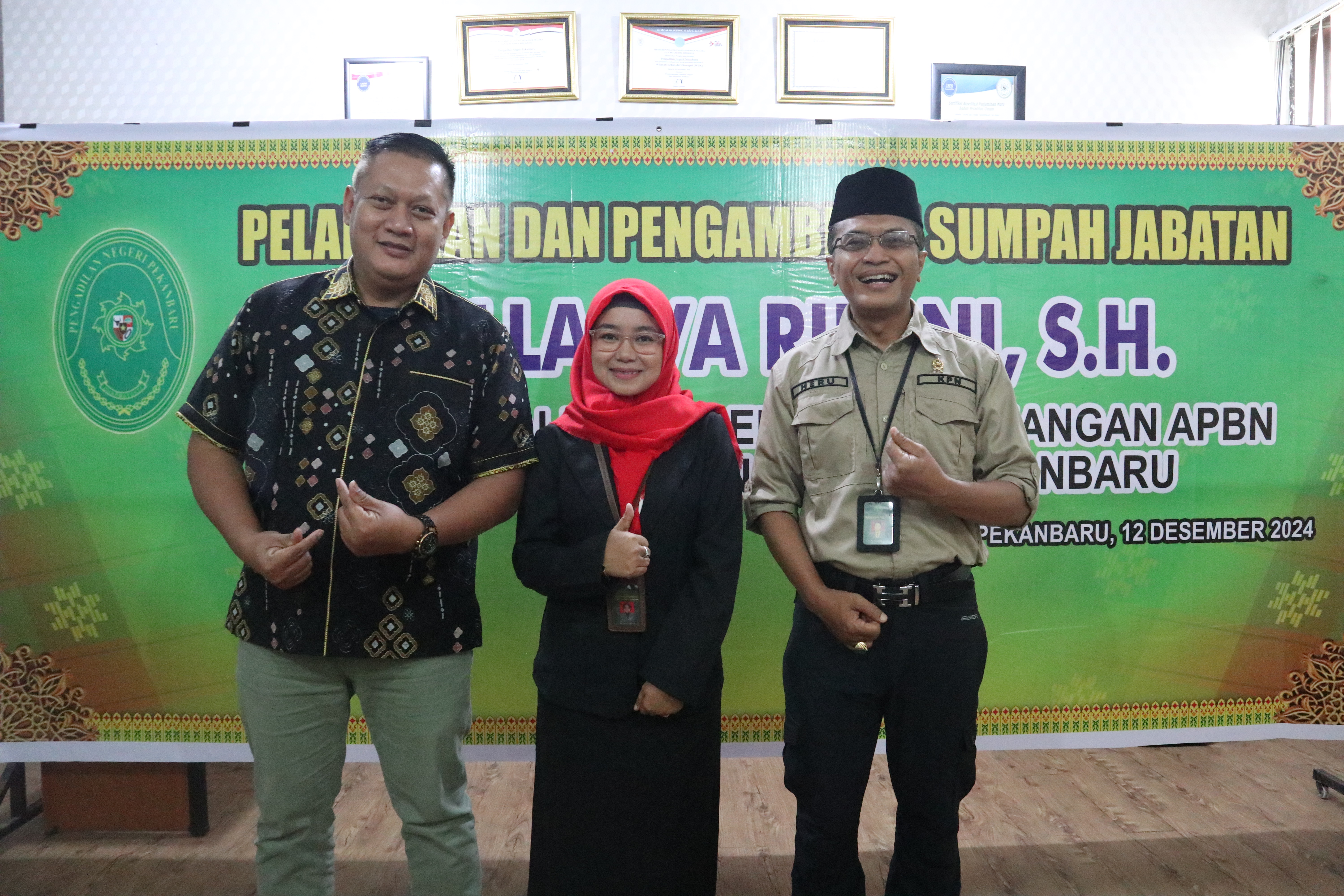 Pengambilan Sumpah dan Pelantikan dipimpin langsung oleh Ketua Pengadilan Negeri Pekanbaru Bapak Raden Heru Kuntodewo, S.H., M.H. Acara tersebut dihadiri oleh Wakil Ketua Bapak Delta Tamtama, S.H., M.H., Para Hakim, Pejabat Struktural dan Fungsional Pengadilan Negeri Pekanbaru.