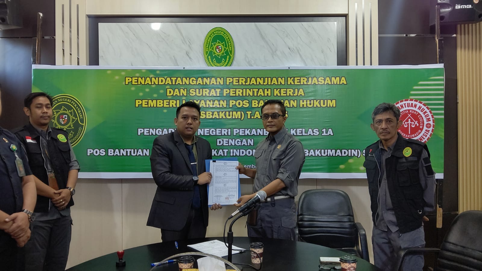 Penandatanganan Perjanjian Kerjasama dan Surat Perintah Kerja Pemberi Layanan Pos Bantuan Hukum (Posbakum) T.A. 2025 Pengadilan Negeri Pekanbaru antara Ketua Pengadilan Negeri Pekanbaru Bpk. Raden Heru Kuntodewo, S.H., M.H. dengan Pos Bantuan Hukum Advokat Indonesia (POSBAKUMADIN) Siak Bpk. Abdul Aziz, SH., MH.