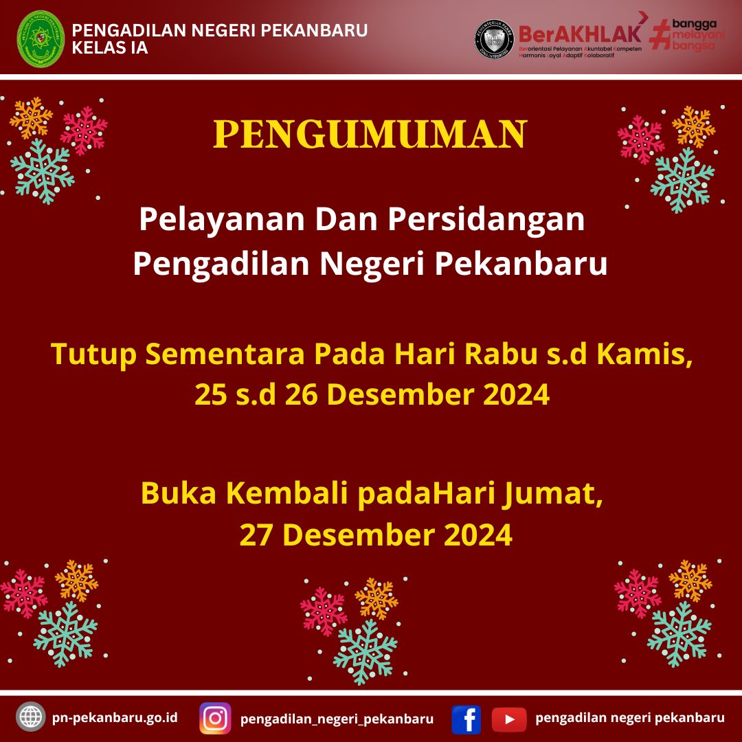 Maka pada hari Rabu s.d Kamis, 25 s.d 26 Desember 2024 Seluruh Pelayanan Pengadilan Negeri Pekanbaru ditutup dan kembali dibuka pada Jumat, 27 Desember 2024.