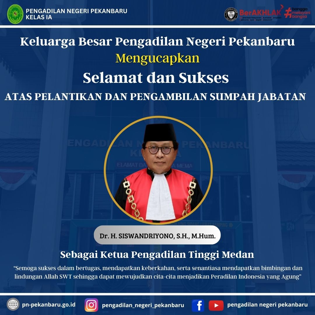 Selamat dan Sukses Atas Pelantikan Dan Pengambilan Sumpah Jabatan Sebagai Ketua Pengadilan Tinggi Medan Bapak Dr. H. SISWANDRIYONO, S.H., M.Hum.