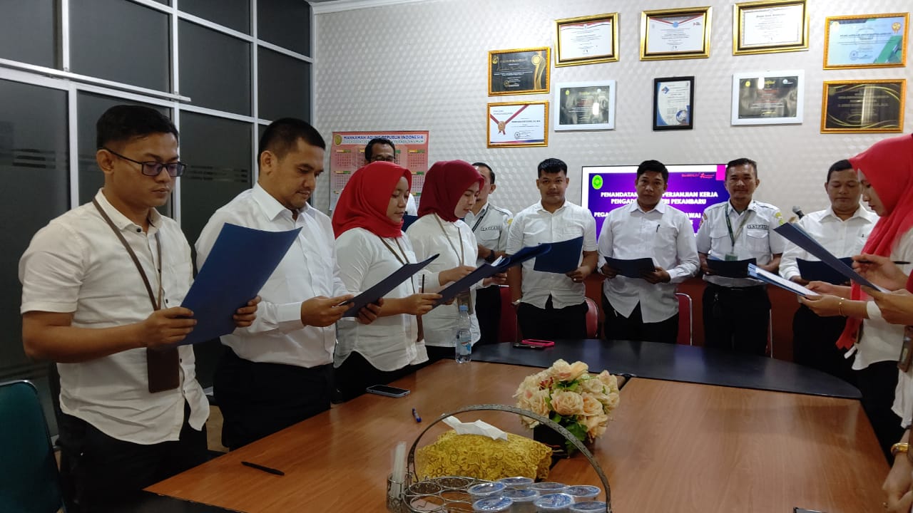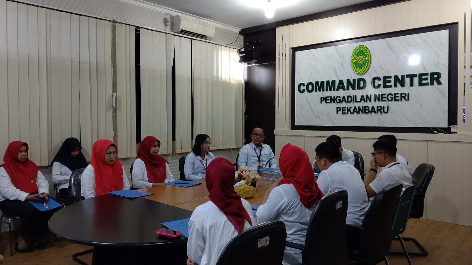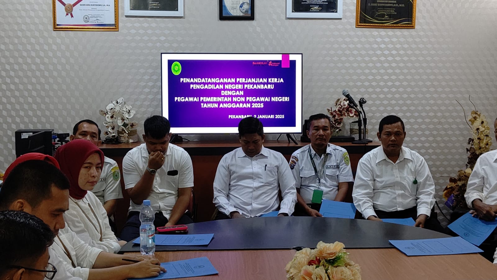 Pekanbaru, Kamis - 02 Januari 2025. Bertempat di Ruang Command Center Pengadilan Negeri Pekanbaru dilaksanakan Penandatanganan Perjanjian Kinerja dan Pengucapan Perjanjian Kinerja Pegawai Pemerintah Non Pegawai Negeri (PPNPN) Tahun 2025 Pada Pengadilan Negeri Pekanbaru. Acara ini dipimpin oleh Ketua Pengadilan Negeri Pekanbaru Bapak Raden Heru Kuntodewo, S.H., M.H., dan dihadiri oleh Sekretaris Pengadilan Negeri Pekanbaru Bapak Erry Mardianto, ST., SH., Kasub Bagian Kepegawaian dan Organisasi Tata Laksana, dan Kasub Bagian Umum dan Keuangan serta seluruh Pegawai Pemerintah Non Pegawai Negeri (PPNPN) Pengadilan Negeri Pekanbaru.