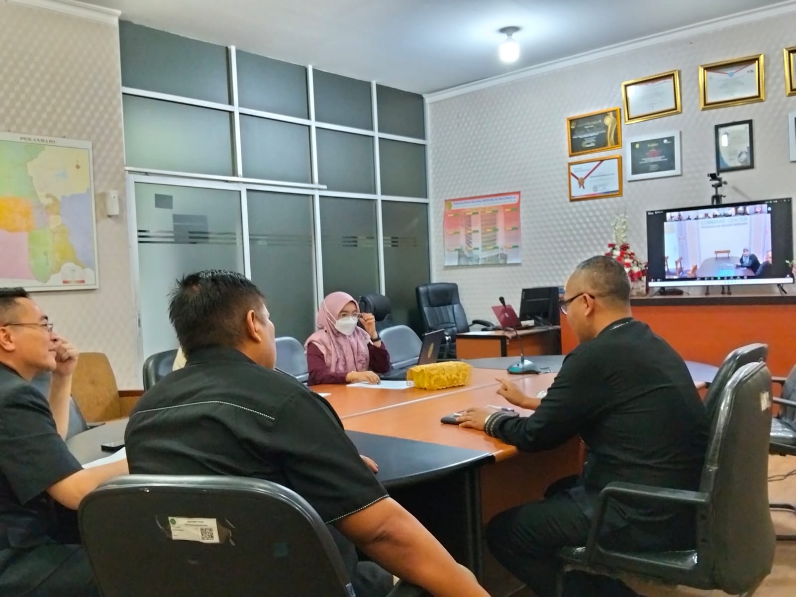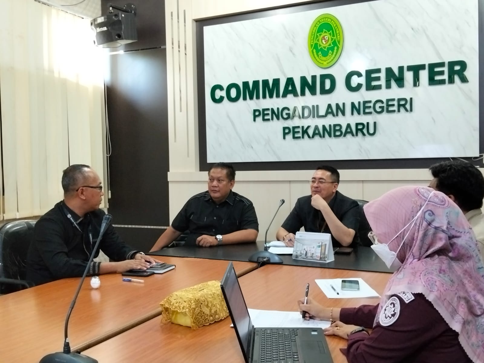 Pekanbaru - Rabu, 04 Juni 2025. Bertempat di Ruang Command Center, Ketua Pengadilan Negeri Pekanbaru Bapak Bambang Trikoro, S.H., M.Hum. di dampingi oleh Wakil Ketua Bapak Delta Tamtama, S.H., M.H. dan dihadiri oleh Sekretaris, Panitera, operator pelaporan layanan hukum pada Pengadilan Negeri Pekanbaru mengikuti Rapat Evaluasi Penginputan Data Pelaporan Layanan Hukum Triwulan I Tahun 2025 secara Daring.