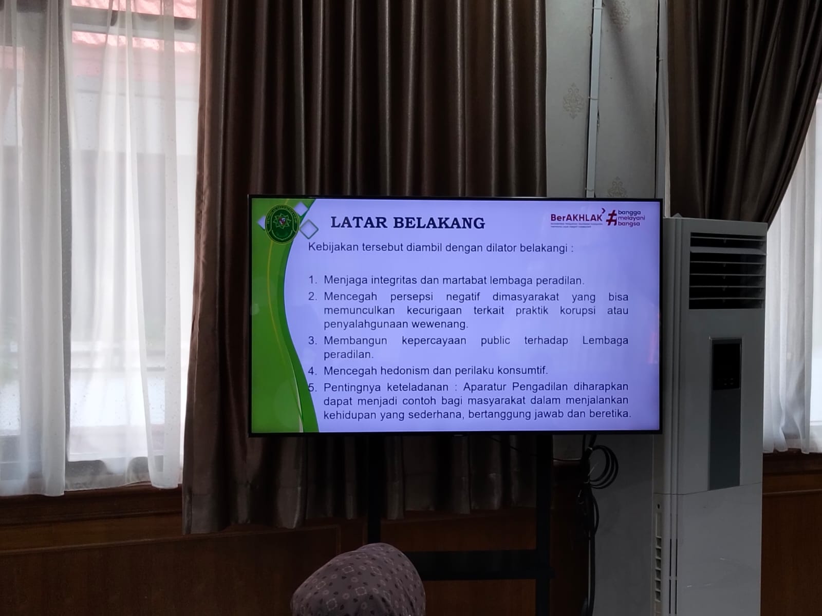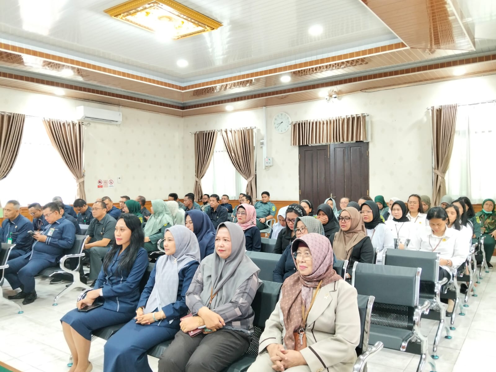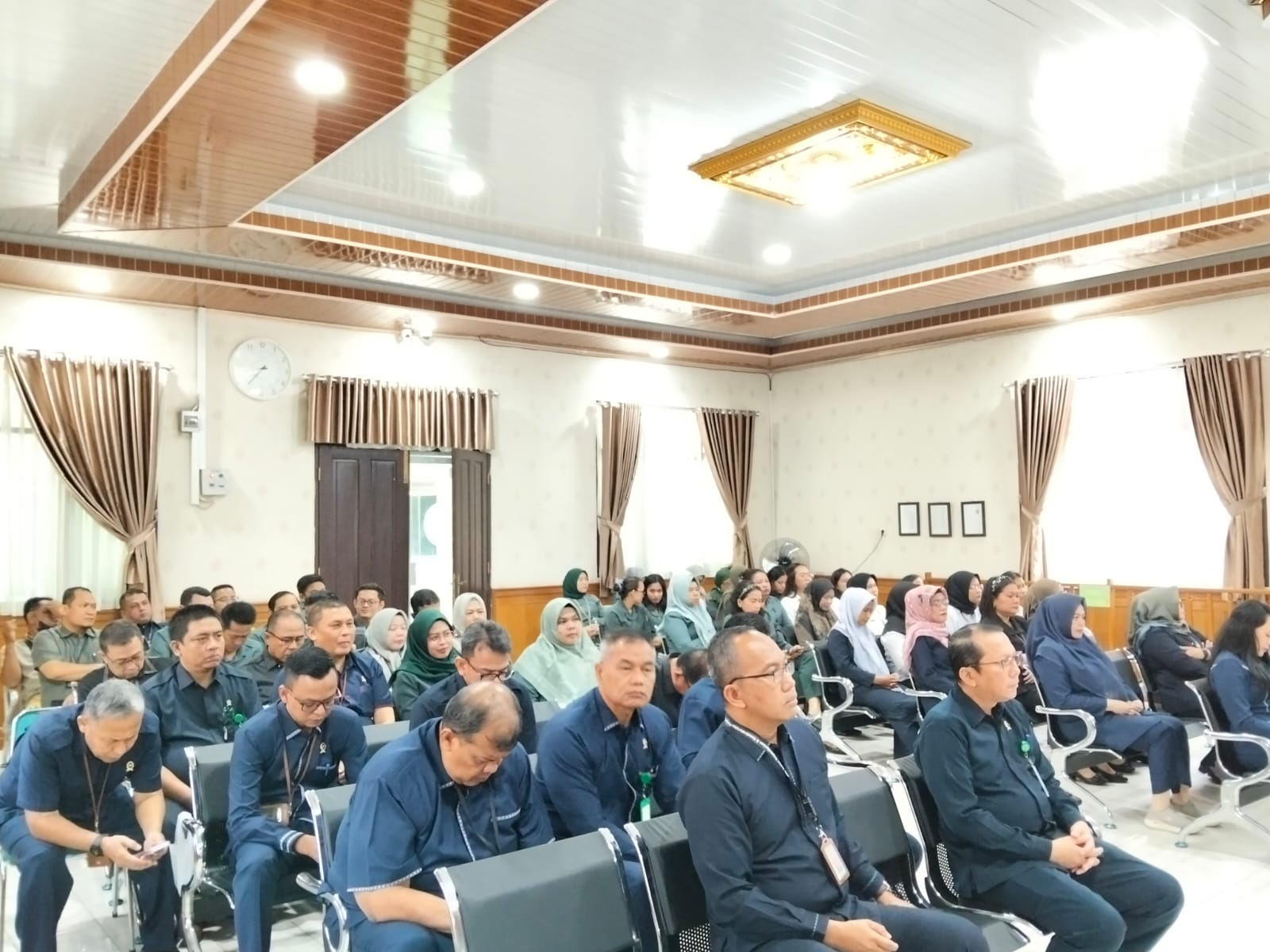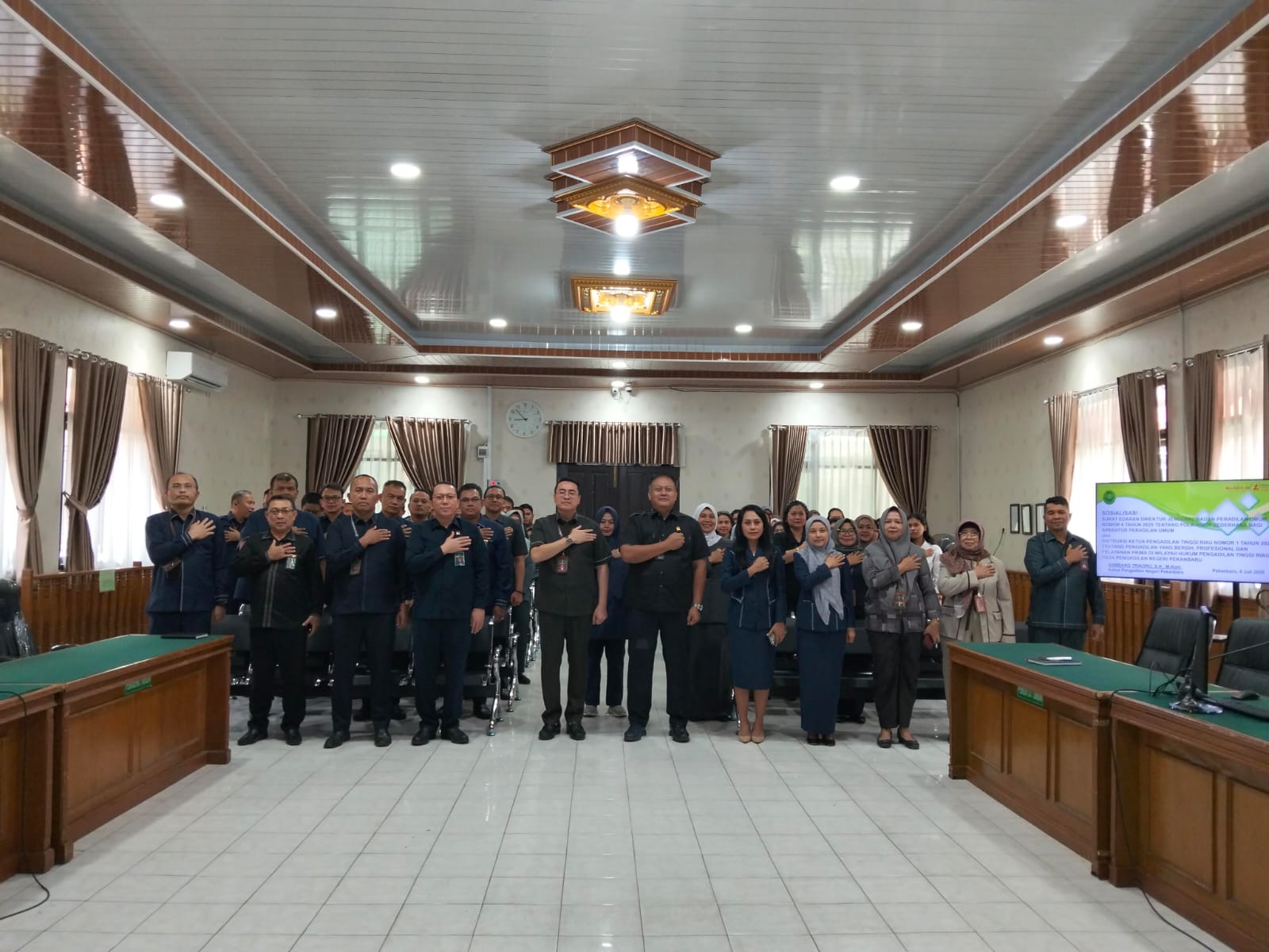 Pekanbaru - Selasa, 08 Juli 2025. Bertempat di Ruang Sidang Prof. R. Soebekti, SH dilaksanakan Kegiatan Sosialisasi Surat Edaran Direktur Jenderal Badan Peradilan Umum Nomor 4 Tahun 2025 Tentang Pola Hidup Sederhana Bagi Aparatur Peradilan Umum Pada Pengadilan Negeri Pekanbaru. Sosialisasi tersebut dipimpin oleh Ketua Pengadilan Negeri Pekanbaru Bapak Bambang Trikoro, S.H., M.Hum. didampingi oleh Wakil Ketua Pengadilan Negeri Pekanbaru Bapak Delta Tamtama, S.H., M.H. dan dihadiri oleh Para Hakim, Hakim Ad Hoc Tipikor, Hakim Ad Hoc PHI, Panitera, Sekretaris, Pejabat Struktural, Pejabat Fungsional, Pelaksana, dan Pegawai Pemerintah Non Pegawai Negeri (PPNPN) pada Pengadilan Negeri Pekanbaru. Narasumber Sosialisasi Sistem Akuntabilitas Kinerja Instansi Pemerintah (SAKIP) tersebut adalah Ketua Pengadilan Negeri Pekanbaru Bapak Bambang Trikoro, S.H., M.Hum.