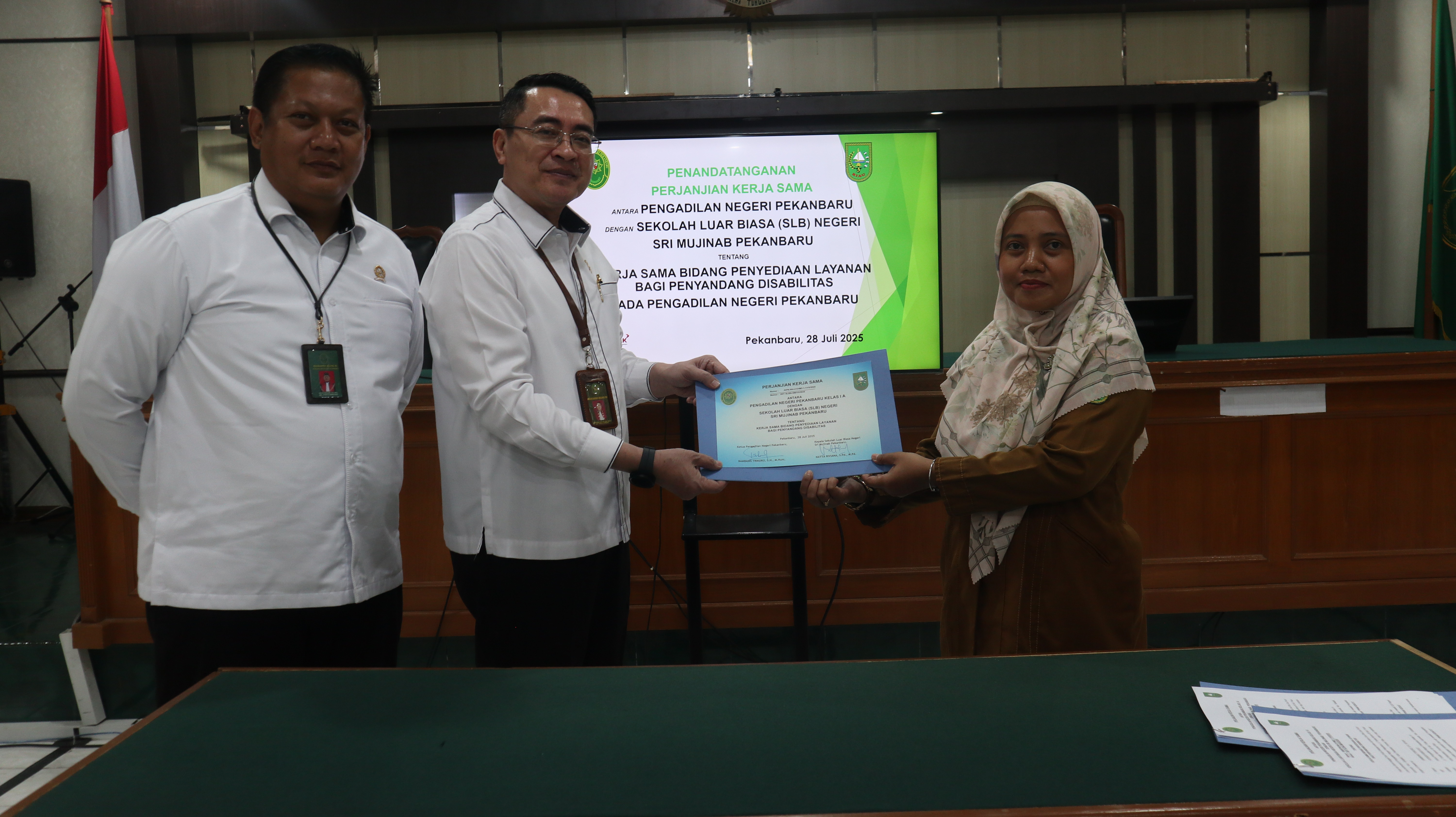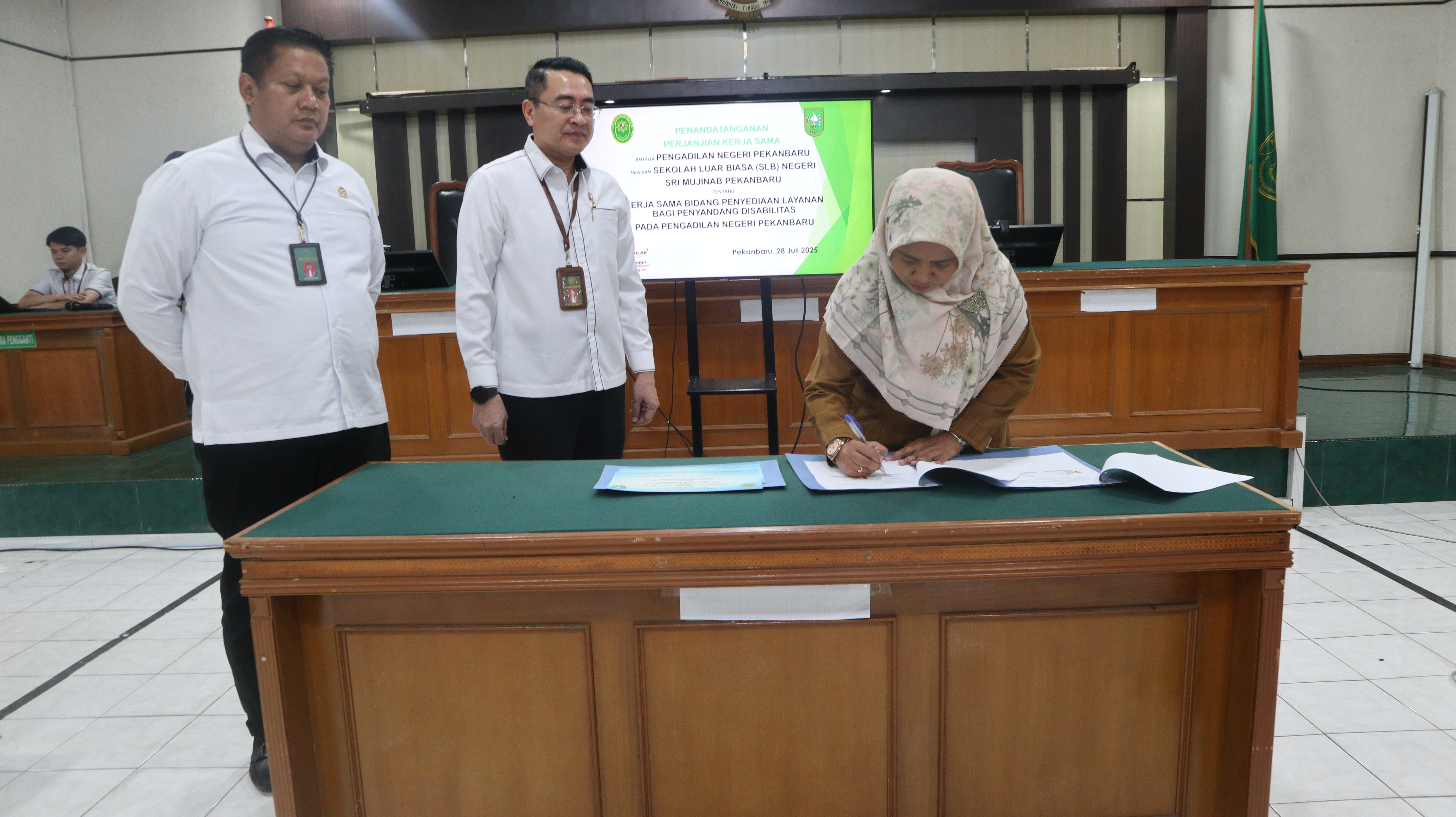 Selasa, 29-07-2025 | 08:11:29 WIBPekanbaru - Senin, 28 Juli 2025. Bertempat di ruang Sidang Prof. Sobekti , SH. Pengadilan Negeri Pekanbaru dilaksanakan acara Penandatanganan Perjanjian Kerjasama Pengadilan Negeri Pekanbaru dengan SLB Negeri Sri Mujinab Pekanbaru tentang Kerjasama Bidang Penyediaan Layanan Bagi Penyandang Disabilitas.