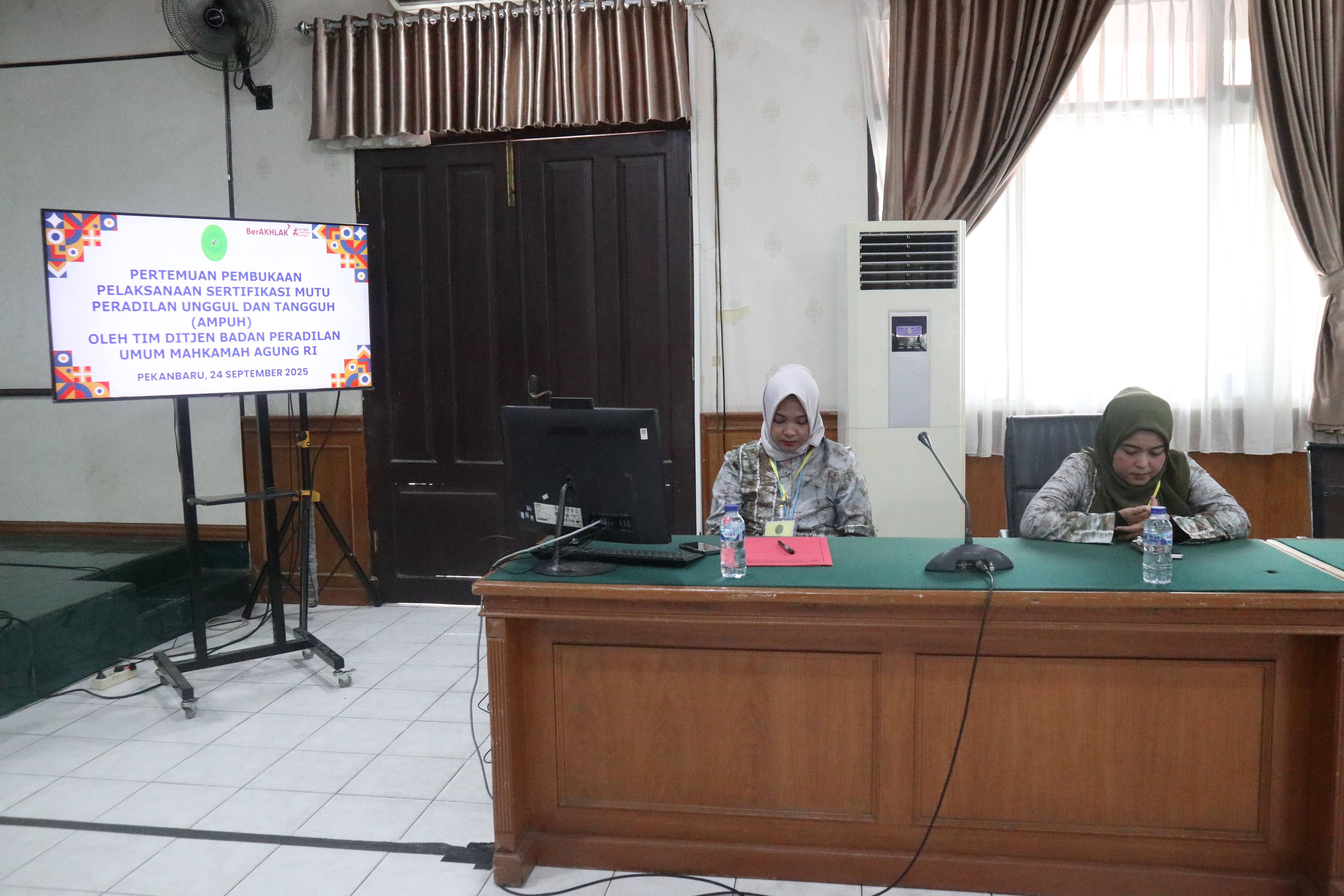 Tujuan dari Penilaian Tim Ditjen Badan Peradilan Umum Mahakamah Agung Republik Indonesia adalah melakukan Penilaian sertifikAsi Mutu Peradilan Unggul dan tangguH (AMPUH) di Pengadilan Negeri Pekanbaru. Penilaian tersebut berlangsung selama Satu hari yakni tanggal 24 September 2025.