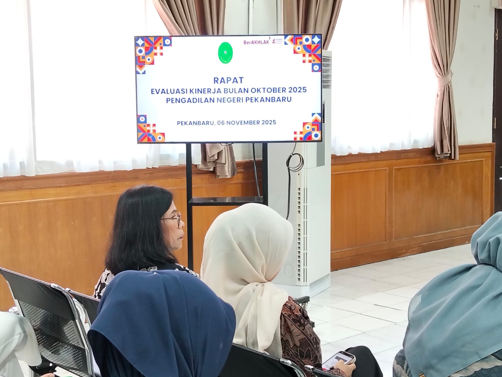 Agenda Evaluasi Kinerja Bulan Oktober 2025 adalah evaluasi kinerja kepaniteraan dan kesekretariatan, penyelesaian perkara, disiplin kerja, capaian kinerja dan pembinaan oleh Wakil Ketua Pengadilan Negeri Pekanbaru.