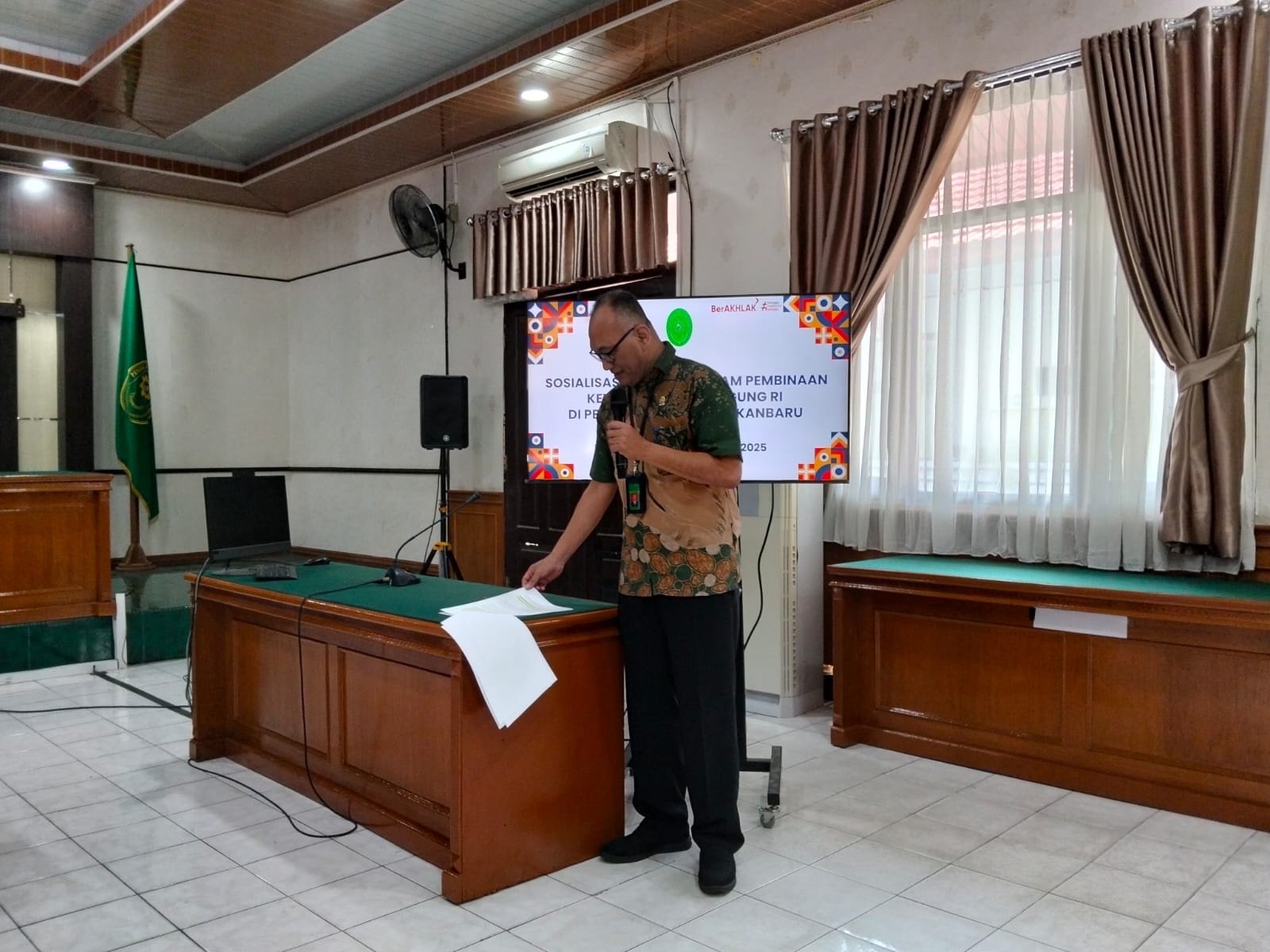 Pekanbaru – Kamis, 06 November 2025. Bertempat di Ruang Sidang Prof. R. Soebekti, SH dilaksanakan Kegiatan Sosialisasi Panitera dalam Pembinaan Ketua mahkamah Agung RI Pada Pengadilan Negeri Pekanbaru. Sosialisasi tersebut dipimpin oleh Wakil Ketua Pengadilan Negeri Pekanbaru Bapak Delta Tamtama, S.H., M.H. dan dihadiri oleh Hakim, Panitera, Sekretaris, Pejabat Struktural, Pejabat Fungsional, Pelaksana, dan Pegawai Pemerintah Dengan Perjanjian Kerja (P3K) pada Pengadilan Negeri Pekanbaru. Narasumber Sosialisasi tersebut adalah Panitera Pengadilan Negeri Pekanbaru Bapak Aslam Irfan Daulay, S.H., M.H.