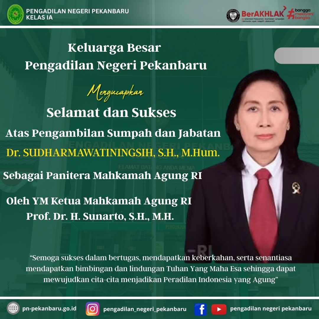 Keluarga Besar Pengadilan Negeri Pekanbaru Mengucapkan: Selamat & Sukses Atas Pengambilan Sumpah Jabatan dan Pelantikan Dr. SUDHARMAWATININGSIH, S.H., M.Hum. Jumat, 13-02-2026 | 10:29:53 WIB